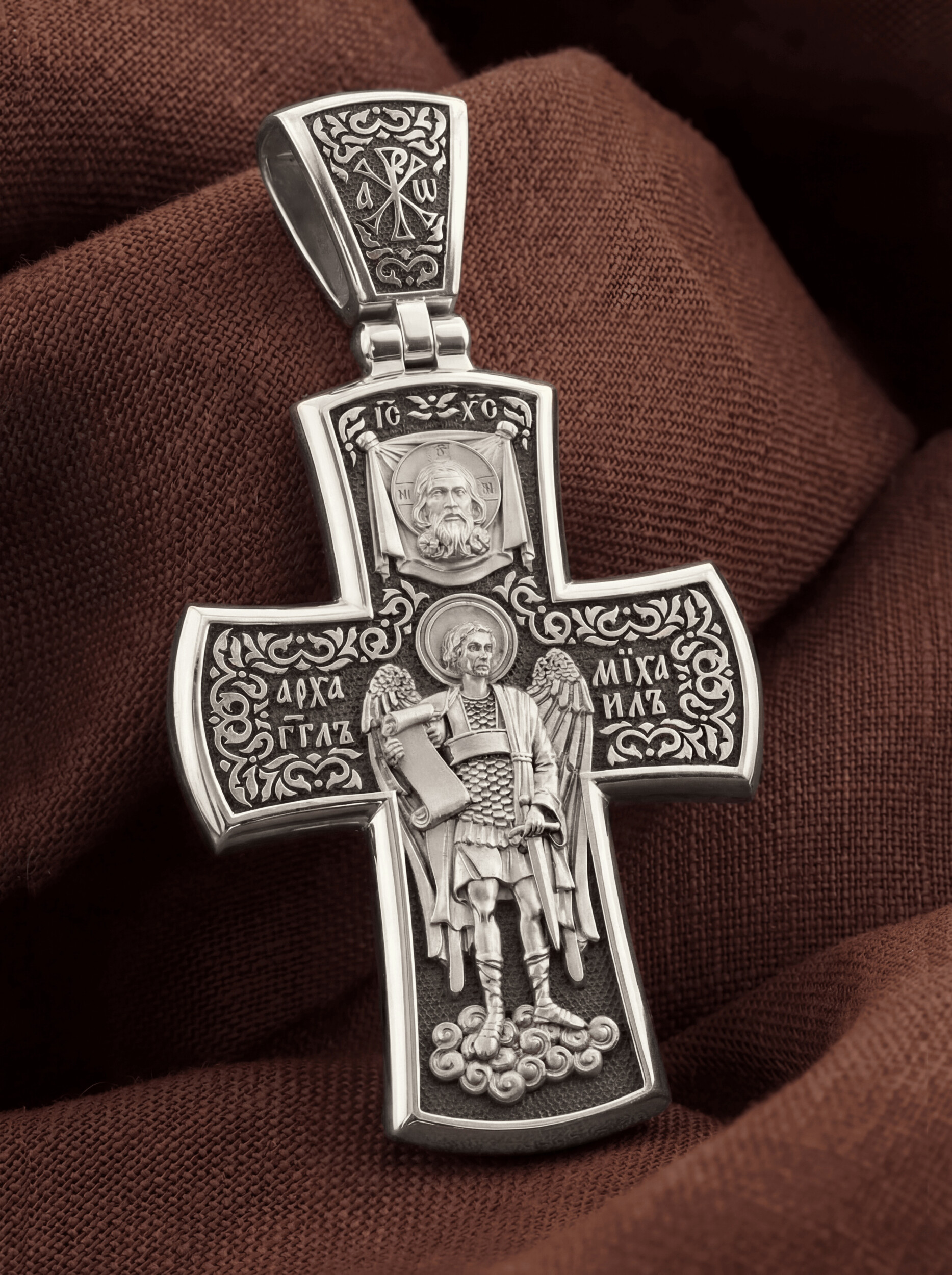 В центре оборотной стороне креста помещен образ Архангела Михаила — верного служителя Божия, который низринул с Неба возгордившегося денницу с другими павшими духами. В Православии его называют Архистратигом, что означает глава святого воинства Ангелов и Архангелов.