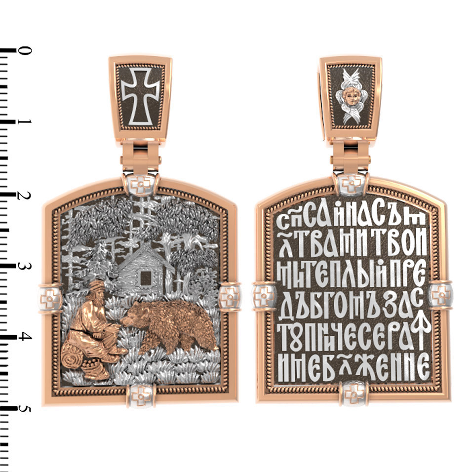 На образке изображен один из самых узнаваемых моментов жития преподобного: Тысячу дней и тысячу ночей Серафим провел в подвиге столпничества на каменном валуне. Узнав о строгой жизни преподобного отца Серафима, многие приходили к нему за советом и наставлениями. Умея узнавать и различать людей, старец от некоторых уклонялся, сохраняя молчание. Но тех, кто имел до него действительную духовную нужду, он охотно принимал и с любовью руководил их своими советами, наставлениями и духовными беседами. Даже диким зверям преподобный Серафим внушал благоговение: многие, посещавшие его в дальней пустыне, видели около него громадного медведя, которого он кормил из рук.