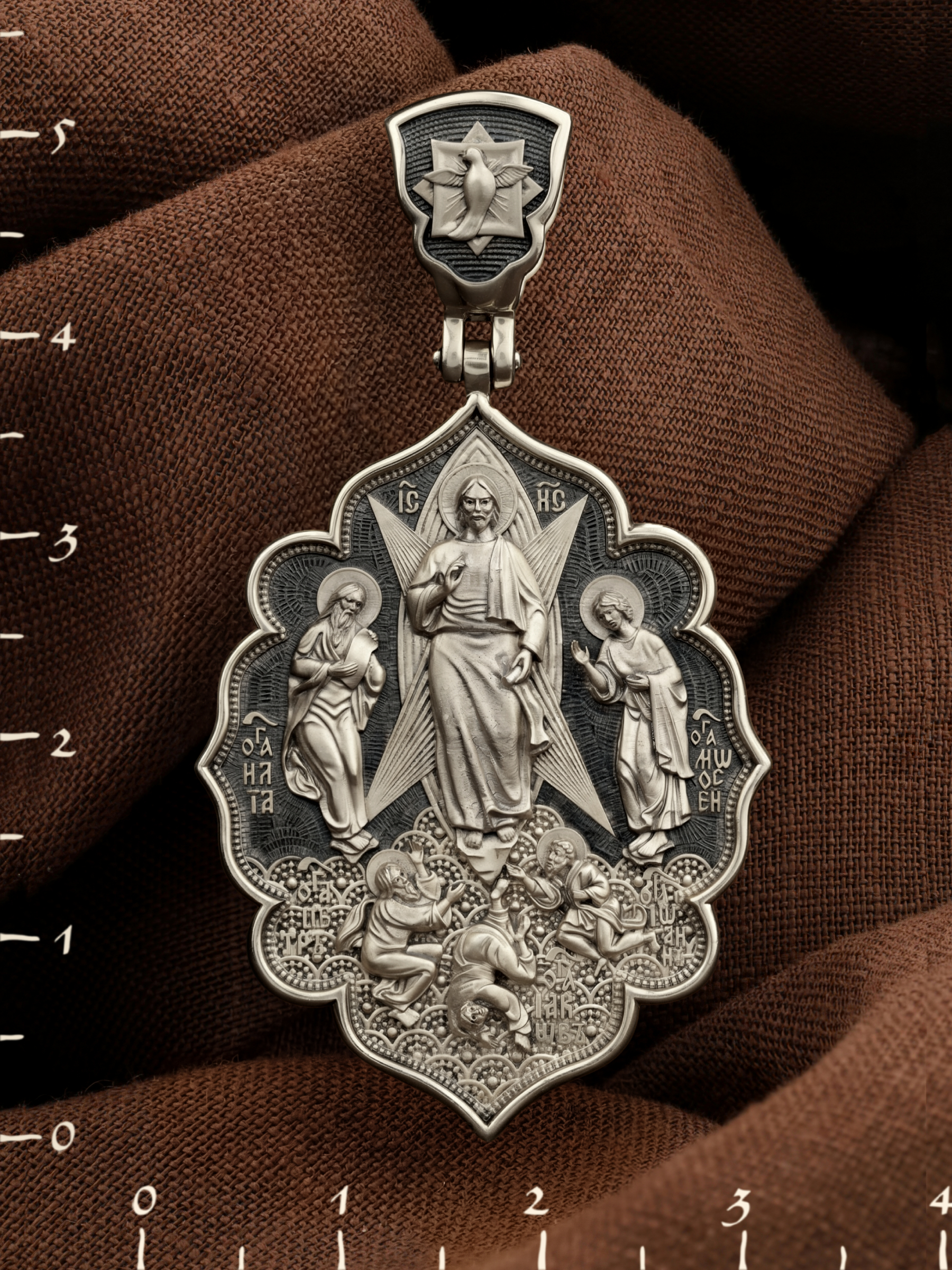 На лицевой стороне образка изображена икона «Преображения Господня». Преображение — одно из немногих Евангельских событий, которое по канону можно изображать не только там, где оно реально происходило. Преображение Господне на иконах можно увидеть на фоне посвященных ему монастырей и храмов. Это объясняется тем, что каждый христианский храм является духовным Фавором, где в церковных таинствах и молитве душа верующих приближается к своему преображению. Образ являет Господа Иисуса Христа в тот момент, когда Он предстал трем Своим ученикам: Петру, Иакову и Иоанну Богослову. Пророки Моисей и Илия предстояли рядом и беседовали с Ним. Апостолы едва могли вынести бесконечную радость, которая охватила их в присутствии Бога. Когда же на гору спустилось облако и раздался глас Божий: «Сей есть Сын Мой Возлюбленный; Его слушайте», апостолы в сильном страхе пали на землю (Лк. 9:35). На иконах «Преображение Господне» они так и изображаются — лежащими у ног Христа. Во главе образка изображен парящий голубь — символ Святого Духа и Его благодати.
