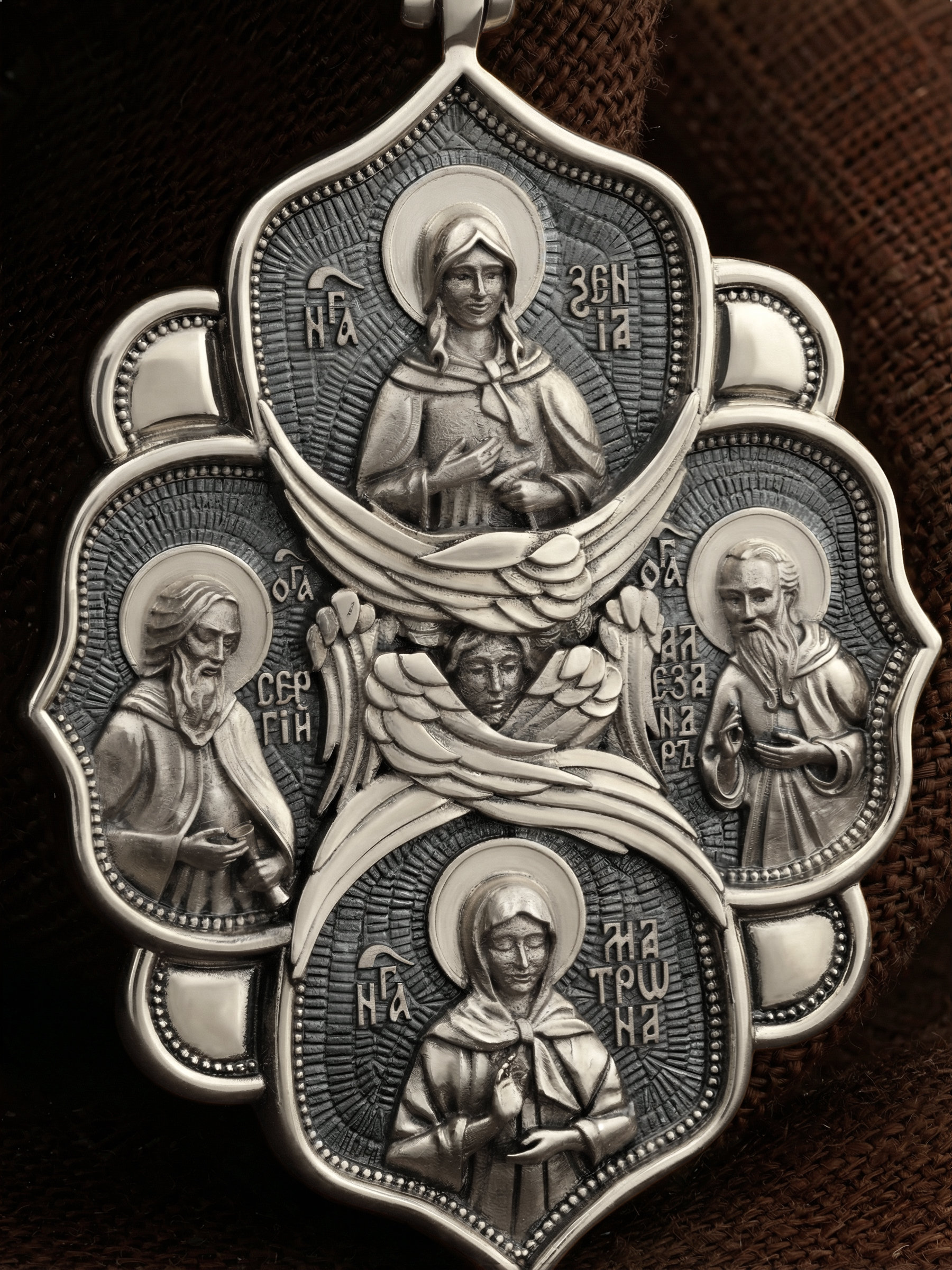 Справа от Серафима изображен преподобный. Александр Свирский. Преподобный Александр Свирский — великий русский святой. Прославился многими чудесами, и один из немногих святых сподобился явления Святой Троицы. Вверху образка изображена блаженная Ксения Петербургская Она прославилась своим подвигом юродства ради Христа. Святая почитается как скорая помощница в устроении семейного счастья, помогает при болезнях детей и близких.