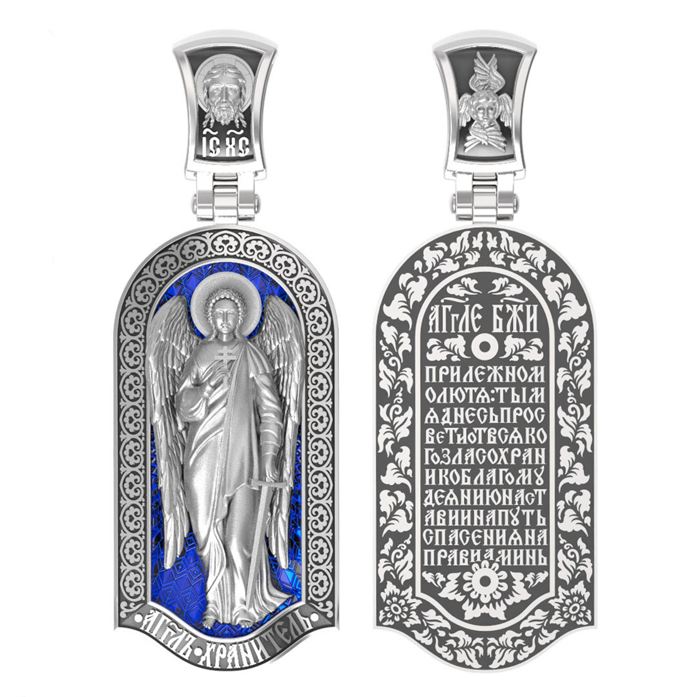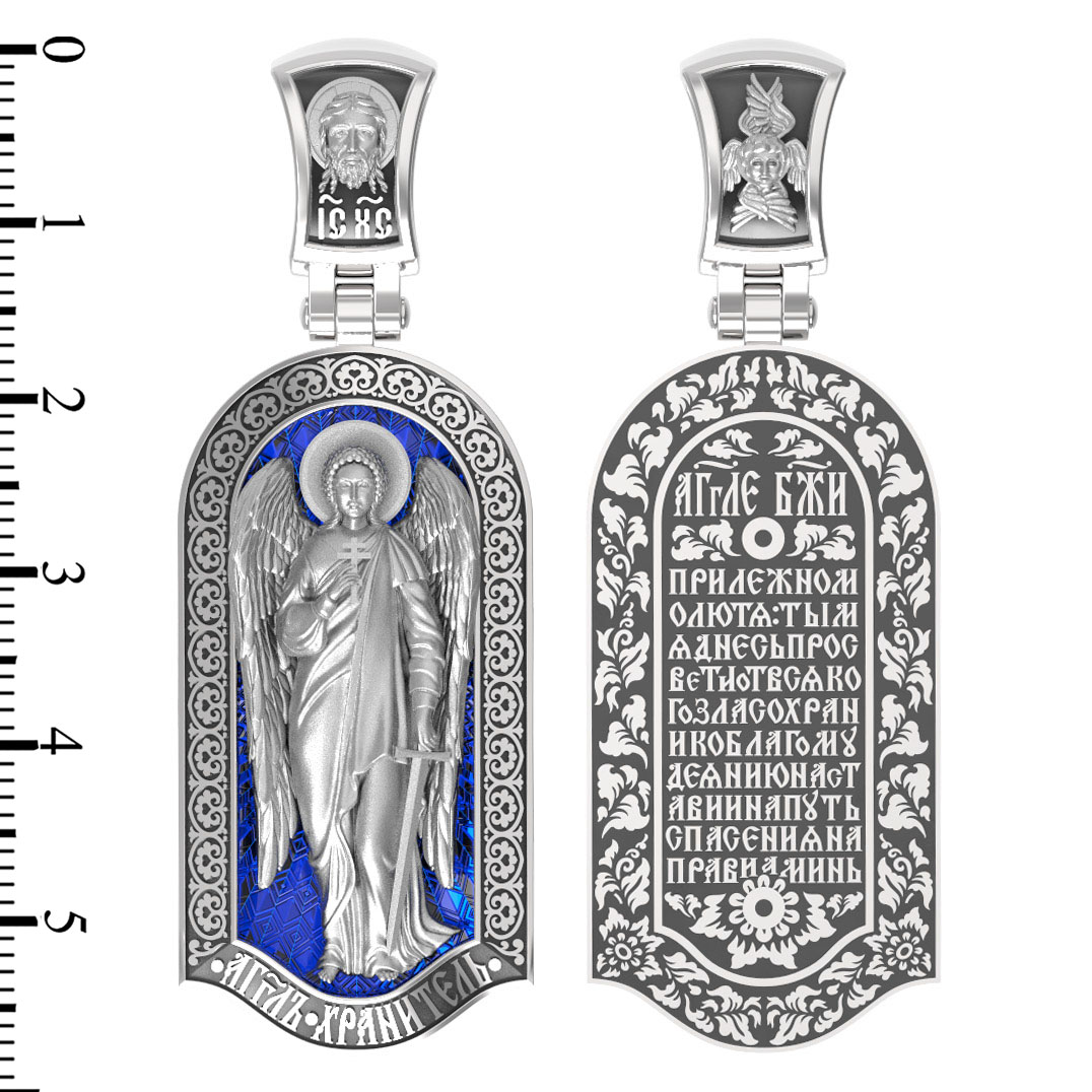 Основой композиции лицевой стороны является Ангела Хранителя. Образок Ангел Хранитель — это не просто украшение, а настоящая миниатюрная икона. В руках Ангел держит традиционные символические атрибуты Ангелов Хранителей: крест — знак послушания Христу и следования Его заповедям, меч — символ непримиримой борьбы, которую он ведет с бесами, отражая их нападения на людей. Слово «ангел» означает «вестник». Ангелы — верные служители Божьи, которых Господь посылает возвещать Свои повеления. Ангелы тварны, как и люди, но имеют другую природу. На иконах они изображаются в человеческом обличье с большими крыльями. Могучие крылья ангелов символизируют быстроту, с которой они исполняют повеления Бога, а небольшие ленточки у ушей –тороки, или слухи — показывают, что они всегда слышат Его голос.