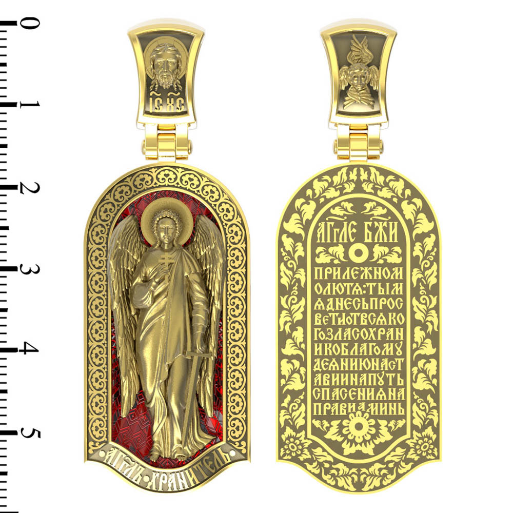 Основой композиции лицевой стороны является Ангела Хранителя. Образок Ангел Хранитель — это не просто украшение, а настоящая миниатюрная икона. В руках Ангел держит традиционные символические атрибуты Ангелов Хранителей: крест — знак послушания Христу и следования Его заповедям, меч — символ непримиримой борьбы, которую он ведет с бесами, отражая их нападения на людей. Слово «ангел» означает «вестник». Ангелы — верные служители Божьи, которых Господь посылает возвещать Свои повеления. Ангелы тварны, как и люди, но имеют другую природу. На иконах они изображаются в человеческом обличье с большими крыльями. Могучие крылья ангелов символизируют быстроту, с которой они исполняют повеления Бога, а небольшие ленточки у ушей –тороки, или слухи — показывают, что они всегда слышат Его голос.