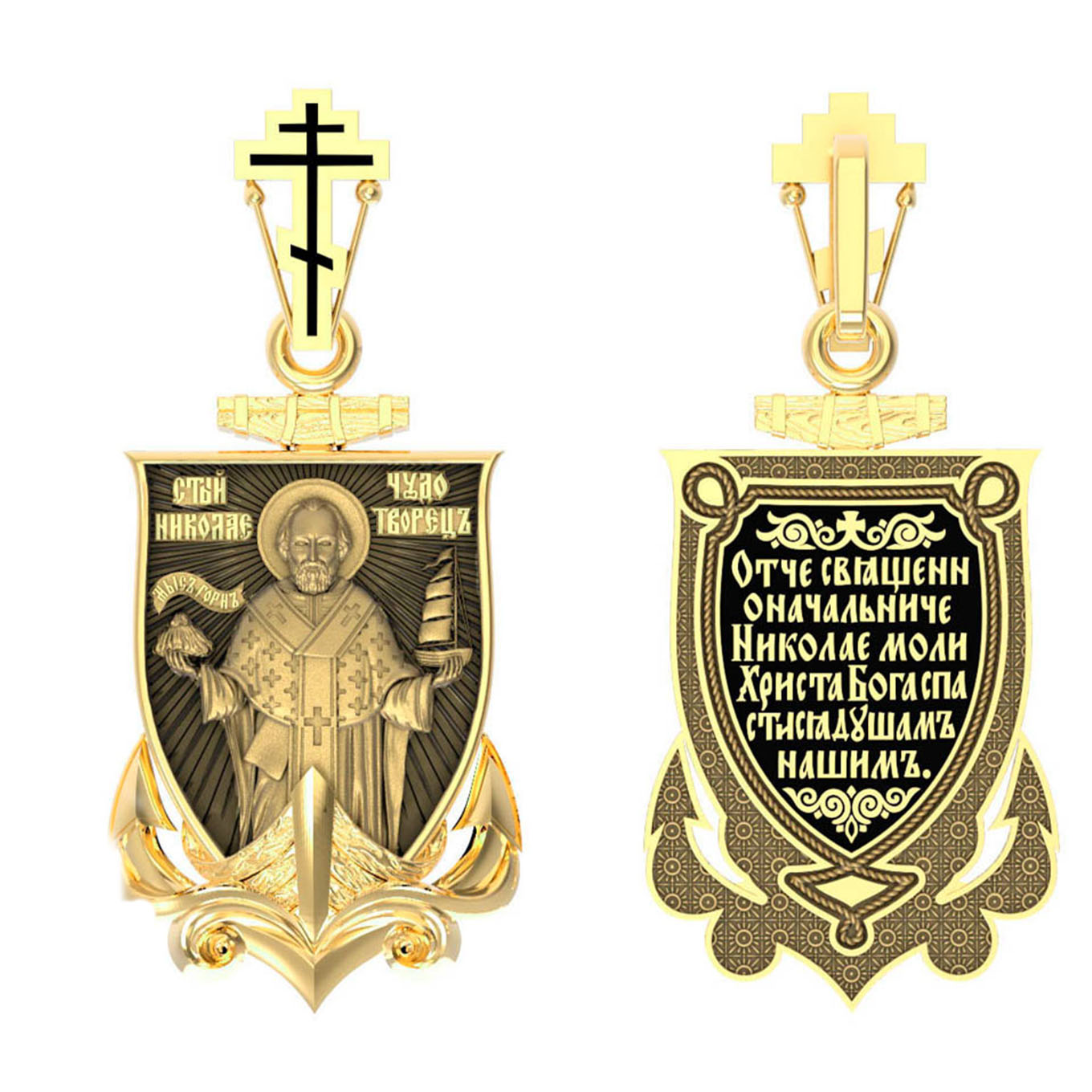 Лицевую сторону возглавляет икона Святителя Николая Чудотворца. Живший в III веке епископ Ликийского города Миры — самый почитаемый святой не только в России, но и во всем мире. Николай Чудотворец, помощник в делах, покровитель учащихся, утешитель обиженных и нуждающихся, целитель самых страшных и тяжелых недугов, предстатель и молитвенник за людей перед Богом. Также Святитель Николай Чудотворец известен своими молитвами за путешественников, когда непрестанный ветер и бушующие волны утихают и корабль заходит в спокойную гавань.