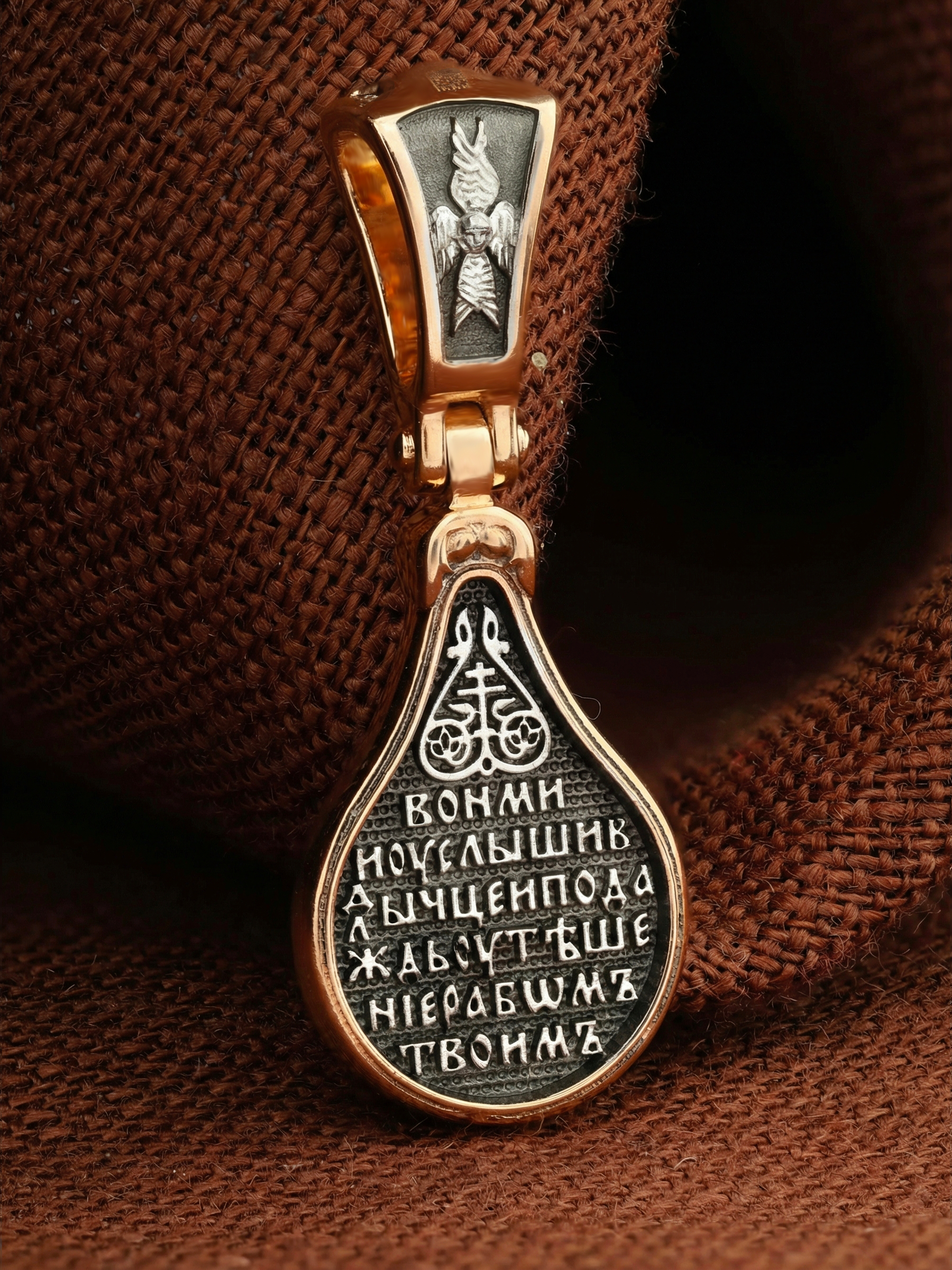 Лицевую сторону образка и кулонное кольцо украшает шестикрылый Серафим — самый приближенный к Господу Ангел.