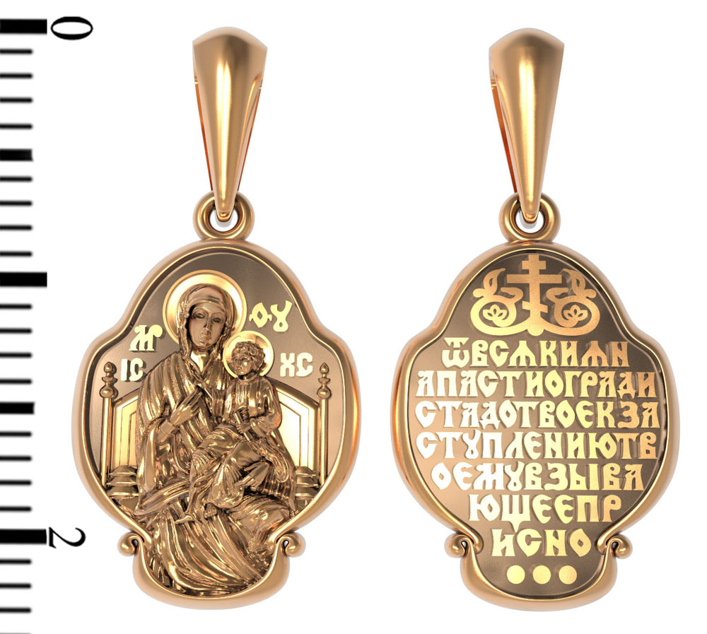На обороте образка написана молитва Богородице в честь Ее иконы «Всецарица» (Пантанасса): «От всякия напасти огради стадо Твое, к заступлению Твоему взывающее присно».