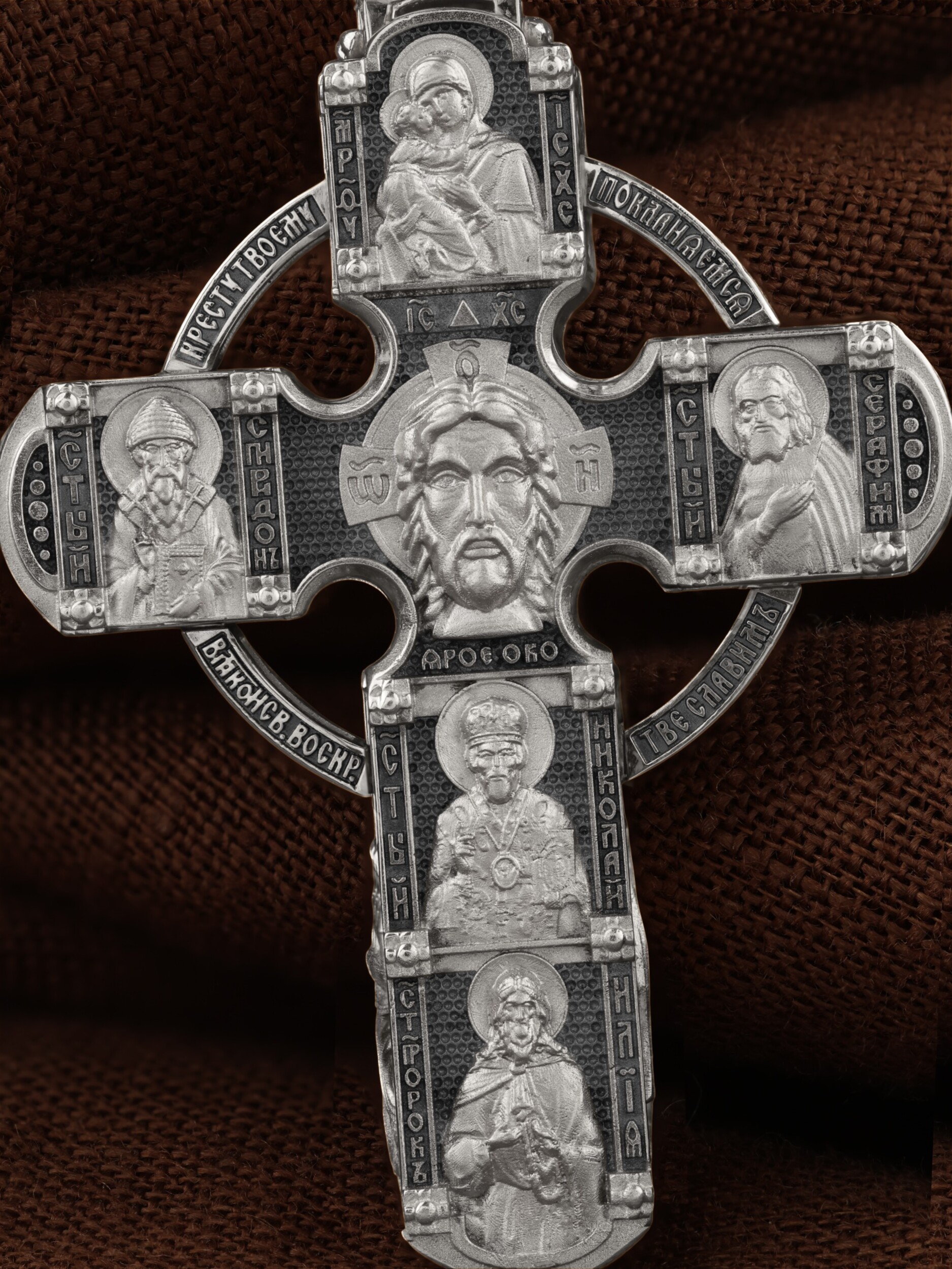 В центре оборотной стороны креста размещен образ Господа и Спасителя нашего Иисуса Христа  — Господь Вседержитель или Пантократор (от греч. всевластный, всесильный). Именование Иисуса «Вседержителем» указывает, с одной стороны, на Его Божественную природу: «Аз есмь Альфа и Омега, начало и конец, говорит Господь, Который есть и был и грядет, Вседержитель» (Откр. 1: 8). С другой стороны, такое именование связано и с человеческой природой Христа, искупившего крестной жертвой людские грехи и обновившего тем самым человеческую природу. Над образом изображена икона Божией Матери «Владимирская», ниже — образы святителя Николая Чудотвореца, архиепископа Мир Ликийских и пророка Ильи. Слева изображен святитель Спиридон Тримифунтский, справа — преподобный Серафим Саровский. На кулонном кольце размещен образ шестикрылого Серафима.
