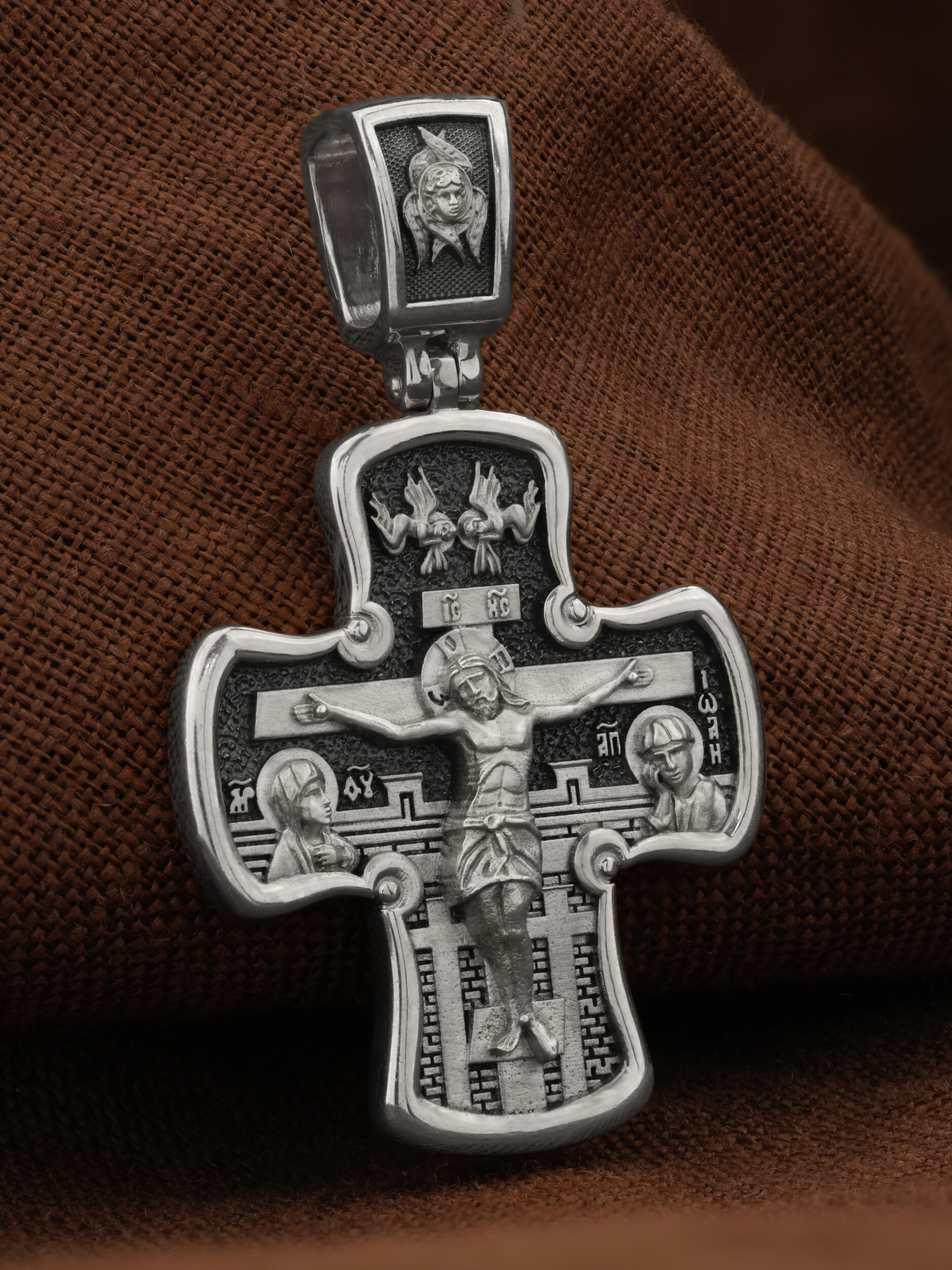 Лицевая сторона креста по канону посвящена Господу Иисусу Христу. Чаще всего на нательных крестах изображается Распятие, которое символизирует победу над грехом и смертью. Своими страданиями Господь искупил грехи человечества: умерев и сошествовав во ад, Он победил дьявола, освободил души праведников от вечной смерти и открыл им Небесные врата рая. Жертва Христа сделала возможным спасение для каждого человека. Поэтому на православных крестах Господь изображается не страдающим, а словно возносящимся и обнимающим весь мир. Он — Спаситель человечества, поправший смертию смерть и призывающий к Себе «все концы земли» (Ис. 45, 22). С двух сторон от Христа изображаются Его Мать, Пресвятая Богородица, и любимый ученик, апостол Иоанн Богослов. Они стояли у Креста неотлучно до самого конца, пока Господь не предал дух Свой Небесному Отцу. Позади — Иерусалимская стена. На иконах она обозначает место казни и символизирует Небесный Иерусалим, путь в который открылся для человечества через Голгофу.