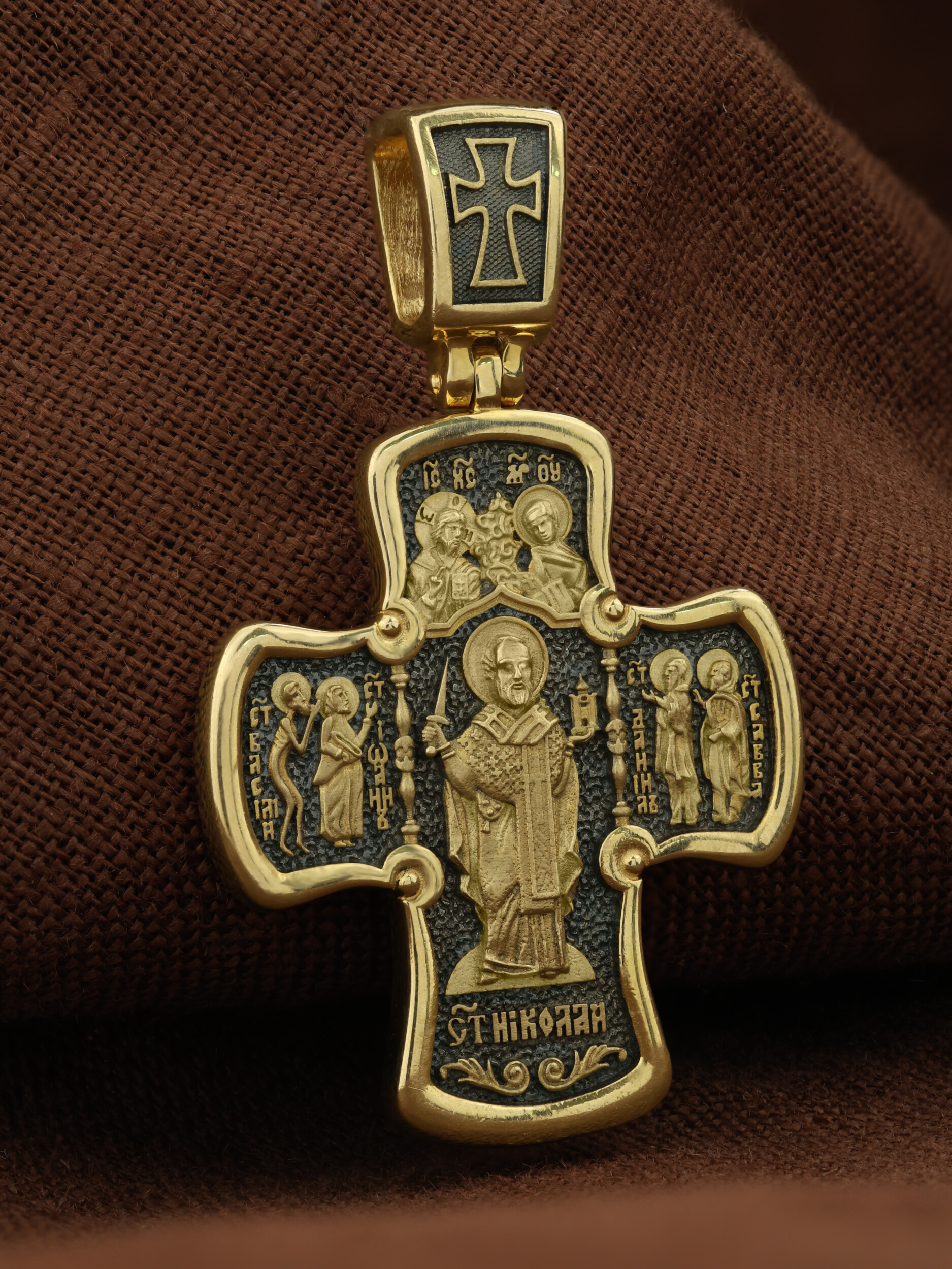 На обороте креста помещена икона самого почитаемого на Руси Святого — Николая Чудотворца (втор. пол. III в.).В руках Они держат знаки епископского достоинства. Чудотворец получил омофор и Евангелие лично из рук Богородицы и Спасителя как защитник и проповедник веры. С двух сторон от Святителя Николая помещены образы великих московских святых, прославившихся чудесами на всю Россию. Слева стоят Христа ради юродивые XVI века: Василий Блаженный, в честь которого назван самый знаменитый русский собор на Красной площади в Москве, и Иоанн Большой Колпак, блаженный, который похоронен в этом храме вместе с Василием Блаженным. Слева — преподобные чудотворцы Даниил Московский, младший сын Александра Невского, и Савва Сторожевский. Оба святых были основателями великих русских монастырей XIV века — Свято-Данилова в Москве и Саввино-Сторожевского в Звенигороде.