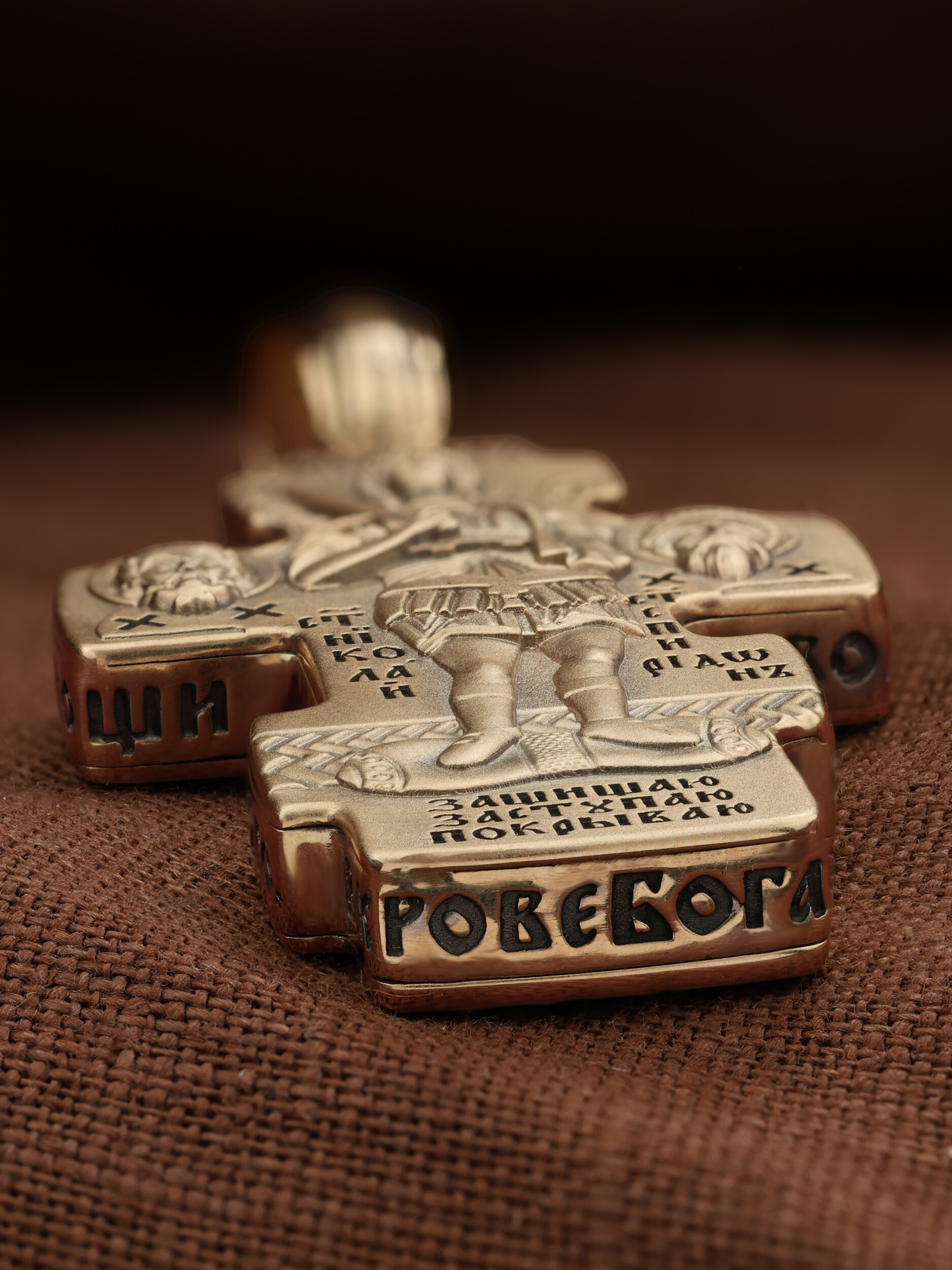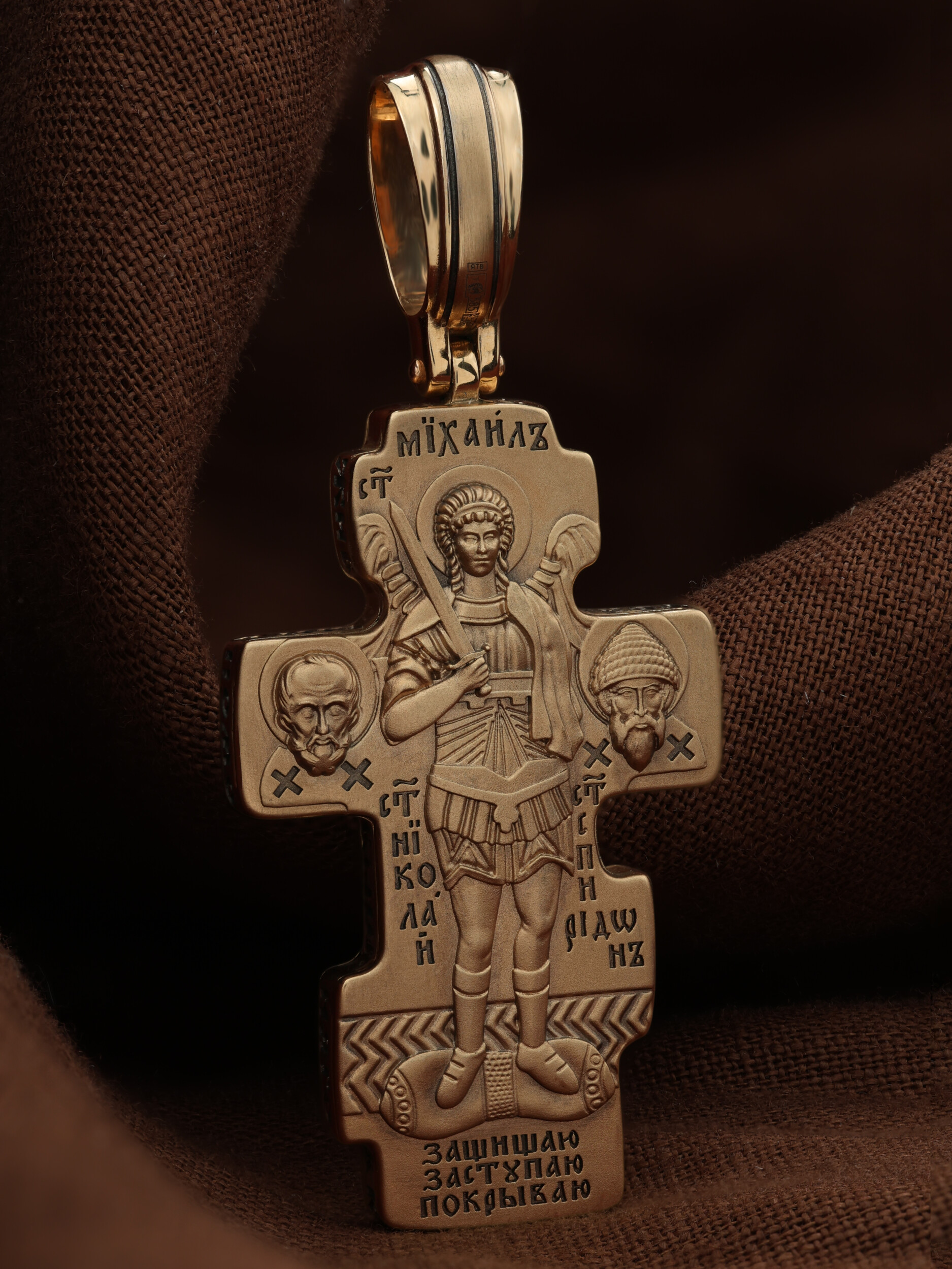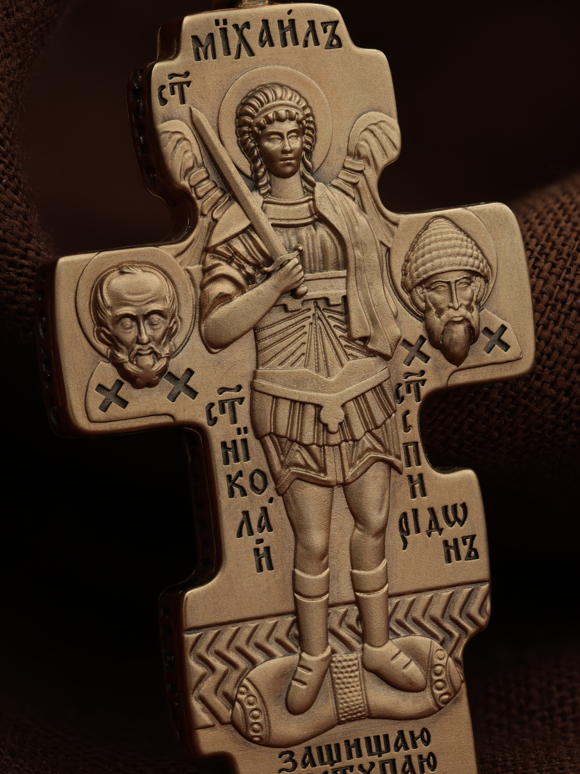 Центральную часть оборотной стороны креста занимает изображение Архангела Михаила — верного служителя Божия, который низринул с Неба возгордившегося денницу с другими павшими духами. В Православии его называют Архистратигом, что означает глава святого воинства Ангелов и Архангелов. Архангел Михаил изображен в воинственном виде с огненным мечом в правой руке. Архангел почитается как покровитель воинов и всех верных Богу и ведущих борьбу против сил зла, борец против ересей, а также защитник душ умерших, страж райских врат. С древних времен прославлен своими чудесами Архангел Михаил на Руси. Слева от образа Архангела изображен Святитель Николай Чудотворец, архиепископ Мир Ликийских, справа — Святитель Спиридон Тримифутский Чудотворец. Святители являются одними из самых почитаемых святых в православном мире. На торцевой стороне креста размещены слова молитвы из 90-го псалма: «Живый в помощи Вышняго, в крове Бога Небеснаго водворится. Речет…»