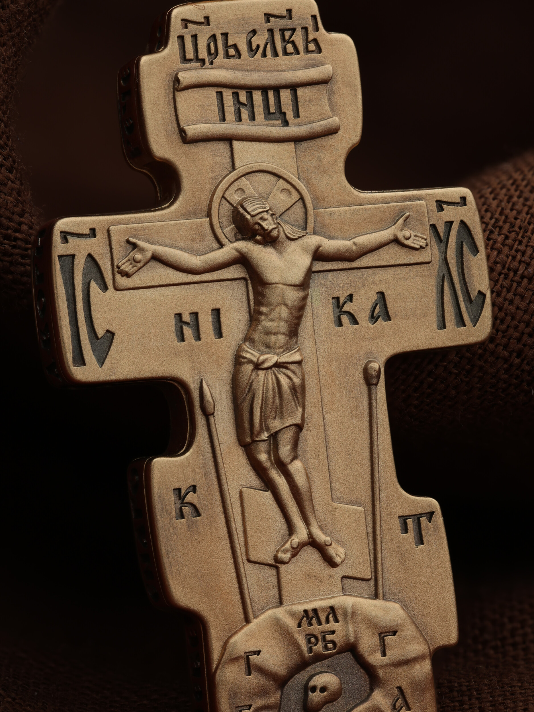 На лицевой стороне креста изображено Распятие Господа и Спасителя нашего Иисуса Христа. Крест- символ спасения и искупления рода человеческого, знамение победы над смертью и адом. Иисус Христос, как искупительная жертва освобождения человечества от власти греха, умер крестной смертью и в третий день воскрес. Над вершиной Распятия помещена надпись «Царь Славы». На верхней табличке, выше головы Иисуса, расположена надпись, составленная Понтием Пилатом — «IНЦI». Она означает «Иисус Назорей, Царь Иудейский». Надпись «IC» «ХC», означает Иисус Христос, помещается на разных сторонах поперечной перекладины креста. Под ней помещено слово «НIКА», что означает Победитель. Крест стоит на горе камней, символизирующих Голгофу, которая обозначена надписью «Г Г». В ее основании различается череп — это голова Адама, обозначенный надписью «Г А». Надпись «МЛРБ» — «место лобное рай бысть» означает место лобное стало раем. Вдоль креста изображены орудия Страстей Христовых: копие сотника Лонгина, которым пронзили подреберье мёртвого Иисуса, чтобы убедиться в Его смерти, и трость с губкой, с которой Иисуса напоили уксусом. Они обозначены буквами «К» и «Т».