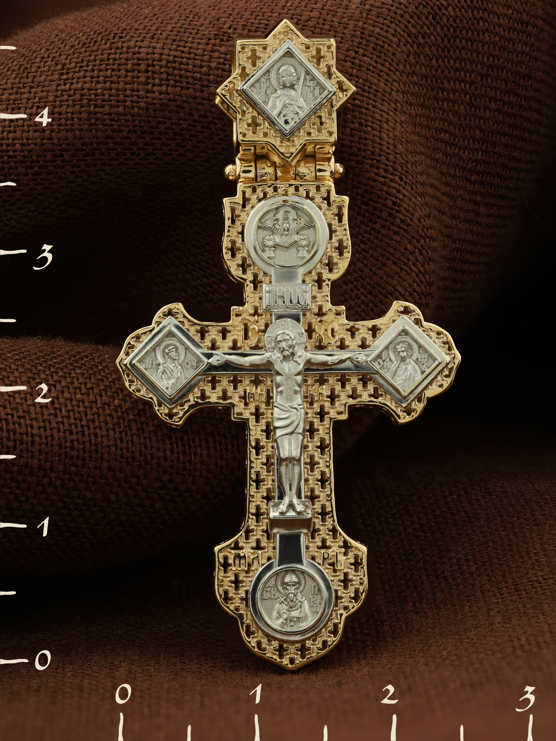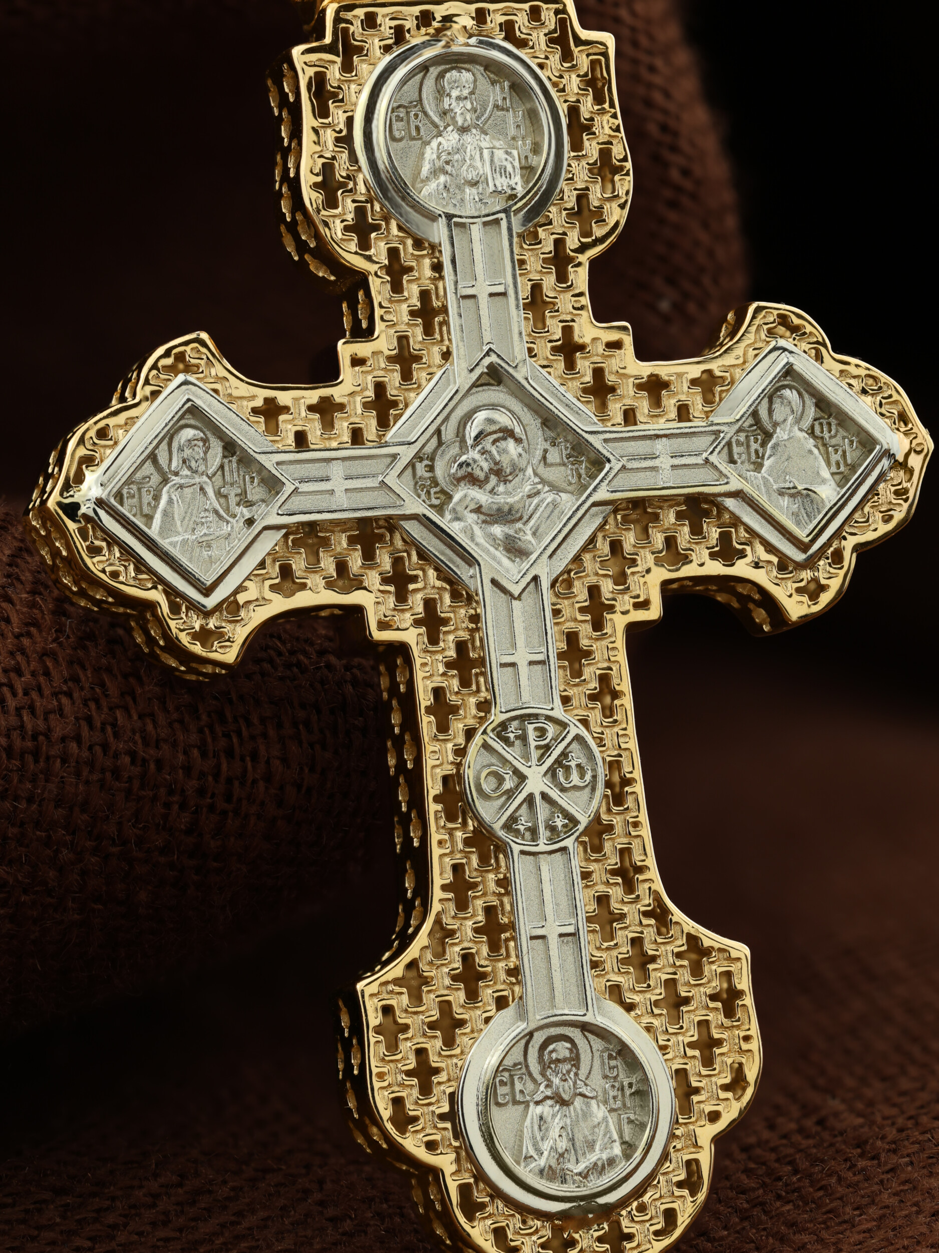 На лицевой стороне креста изображено Распятие Господа и Спасителя нашего Иисуса Христа. Крест- символ спасения и искупления рода человеческого, знамение победы над смертью и адом. Иисус Христос, как искупительная жертва освобождения человечества от власти греха, умер крестной смертью и в третий день воскрес. На верхней табличке, выше головы Иисуса, расположена надпись, составленная Понтием Пилатом — «IНЦI». Она означает «Иисус Назорей, Царь Иудейский». Над перекладиной написано сокращенно имя Спасителя «IC» «XC» — Иисус Христос. Ниже перекладины написано слово «НИКА» (греч. — Победитель). Слева от Распятия помещен лик Пречистой Богородицы, скорой помощницы и заступницы рода Христианского. Слева изображен апостол и евангелист Иоанн Богослов, один из ближайших учеников Иисуса Христа. Над Распятием изображение Этимасии (греч. — готовность) — престола, уготованного для второго пришествия Господа Иисуса Христа, грядущего вершить Суд над живыми и мертвыми (Пс.IX,5−8). Ниже Распятия размещен образ Святителя Спиридона Тримифунтского. На лицевой стороне кулонного кольца изображен Ангел Хранитель, а на оборотной стороне — слова молитвы: «Господи помилуй. Спаси и сохрани».