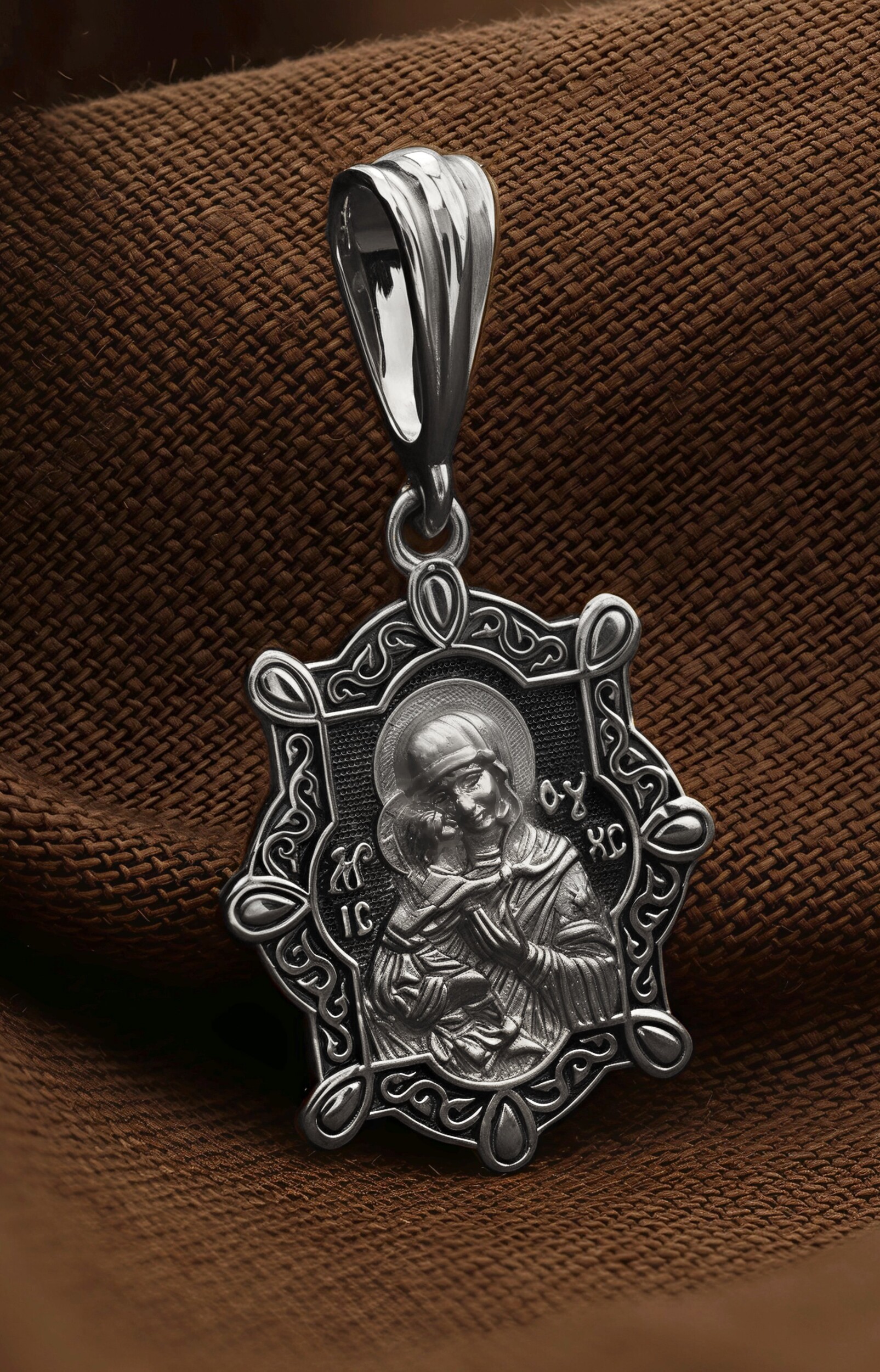 Лицевую сторону возглавляет Владимирская икона Божией Матери — самая великая русская святыня, многие века бывшая олицетворением нашей земли. Перед ней венчались на царство государи, избирались патриархи. Пречистой Богородице Владимирской клялись в верности Отечеству солдаты и за нее умирали на поле брани. Именно на ее защиту более всего уповала Россия в самые страшные периоды своей истории. Владимирская икона Божией Матери, по преданию, была написана на доске трапезного стола из дома Иисуса Христа. На Русь она была привезена в начале XII века и с тех пор почитается как главная святыня нашего Отечества. Перед ней молитвенно просят Богородицу об исцелении от телесных недугов, в частности, заболеваний сердца и сердечнососудистой системы. За помощью к ней обращаются во время бедствий, когда нуждаются в защите от врагов.