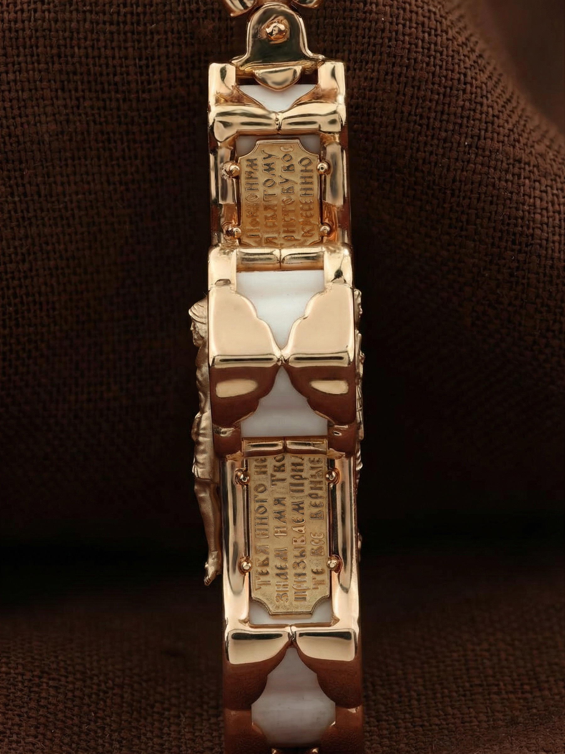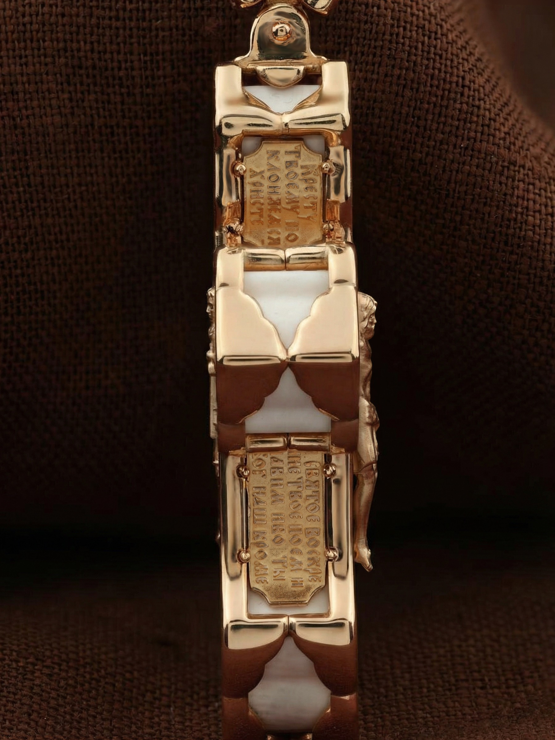В центре оборотной стороне креста изображен Святой Агнгел-Хранитель в виде юноши держащего в правой руке крест, а в левой — мечь. Агнгел-Хранитель — это Ангел приставляемый Богом к человеку при крещении для охраны и помощи в добрых делах. Он невидимо находится при человеке на протяжении всей его жизни, если человек сохраняет в себе любовь к Богу и истинную веру перед Ним. По сторонам от изображения помещена молитва: «Ангеле Божий, хранителю мой святый, на соблюдение мне от Бога с небесе данный! Прилежно молю тя: ты мя днесь просвети, и от всякаго зла сохрани, ко благому деянию настави…». На кулонном кольце изображена икона Божией Матери «Покров Пресвятой Богородицы».