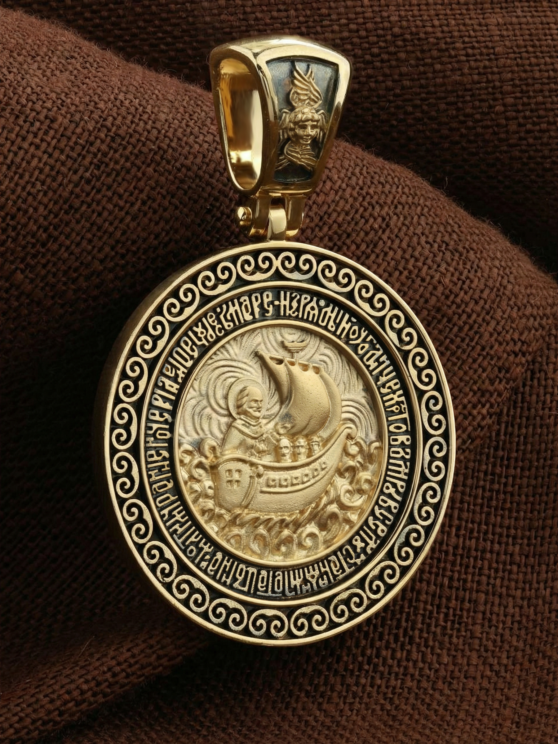 Лицевую сторону возглавляет икона Святителя Николая Чудотворца. Живший в III веке епископ Ликийского города Миры — самый почитаемый святой не только в России, но и во всем мире. Николай Чудотворец, помощник в делах, покровитель учащихся, утешитель обиженных и нуждающихся, целитель самых страшных и тяжелых недугов, предстатель и молитвенник за людей перед Богом. Также Святитель Николай Чудотворец известен своими молитвами за путешественников, когда непрестанный ветер и бушующие волны утихают и корабль заходит в спокойную гавань.
