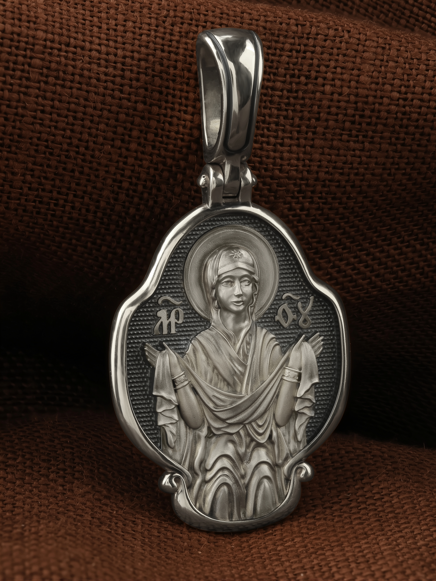 На лицевой части образка изображена икона Покров Пресвятой Богородицы. Праздник Покрова Божией Матери является воспоминанием чуда, которое произошло во Влахнернской церкви 1 (14) октября 910 года: Пресвятая Богородица явилась верующим над алтарем храма и распростерла над ними Свое покрывало. В этот день Божья Матерь открыла людям, что Она является Ходатаицей за них перед Богом. Богородица простирает Свой молитвенный покров над всеми православными христианами и умоляет Сына Своего о даровании вечного спасения каждому человеку.