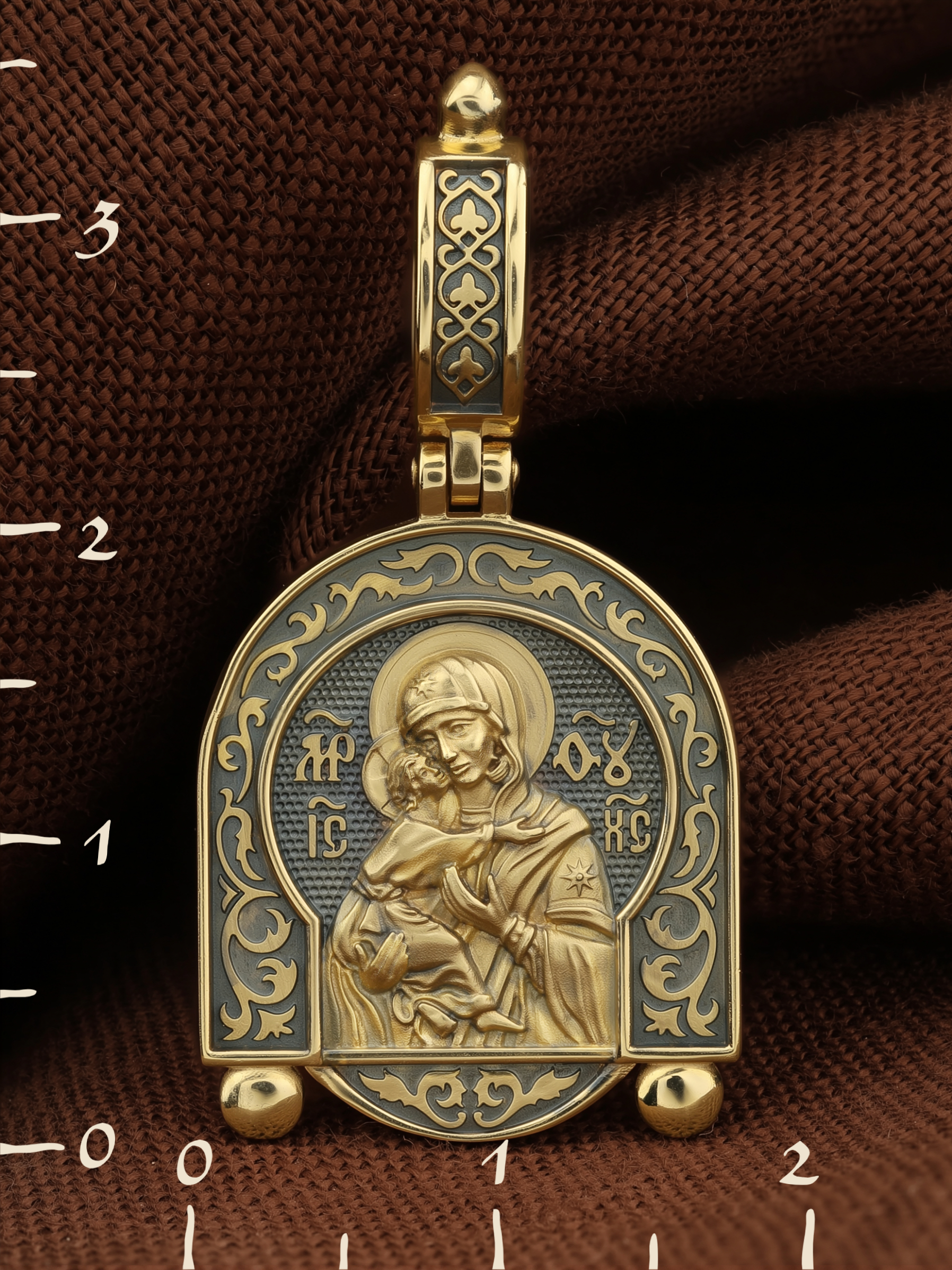 Лицевую сторону возглавляет Владимирская икона Божией Матери — самая Великая русская Святыня, многие века бывшая олицетворением нашей земли. Перед ней венчались на царство государи, избирались патриархи. Пречистой Богородице Владимирской клялись в верности Отечеству солдаты и за нее умирали на поле брани. Именно на ее защиту более всего уповала Россия в самые страшные периоды своей истории. Владимирская икона Божией Матери, по преданию, была написана на доске трапезного стола из дома Иисуса Христа. На Русь она была привезена в начале XII века и с тех пор почитается как главная святыня нашего Отечества. Перед ней молитвенно просят Богородицу об исцелении от телесных недугов, в частности, заболеваний сердца и сердечнососудистой системы. За помощью к ней обращаются во время бедствий, когда нуждаются в защите от врагов.