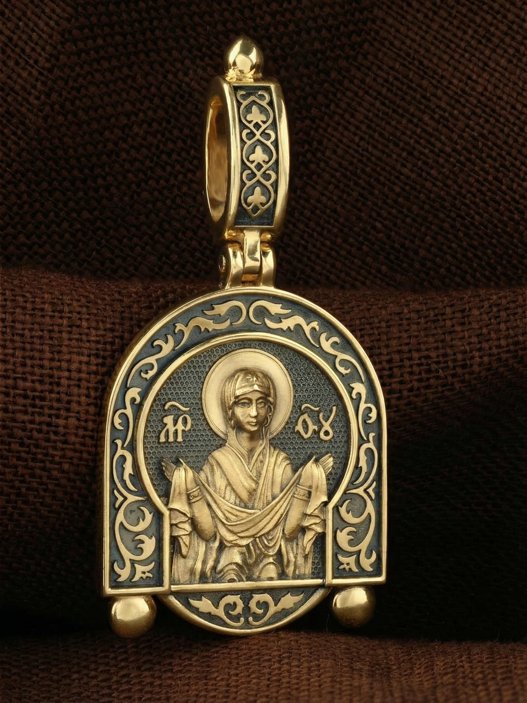 На лицевой части образка изображена икона Покров Пресвятой Богородицы. Праздник Покрова Божией Матери является воспоминанием чуда, которое произошло во Влахнернской церкви 1 (14) октября 910 года: Пресвятая Богородица явилась верующим над алтарем храма и распростерла над ними Свое покрывало. В этот день Божья Матерь открыла людям, что Она является Ходатаицей за них перед Богом. Богородица простирает Свой молитвенный покров над всеми православными христианами и умоляет Сына Своего о даровании вечного спасения каждому человеку.
