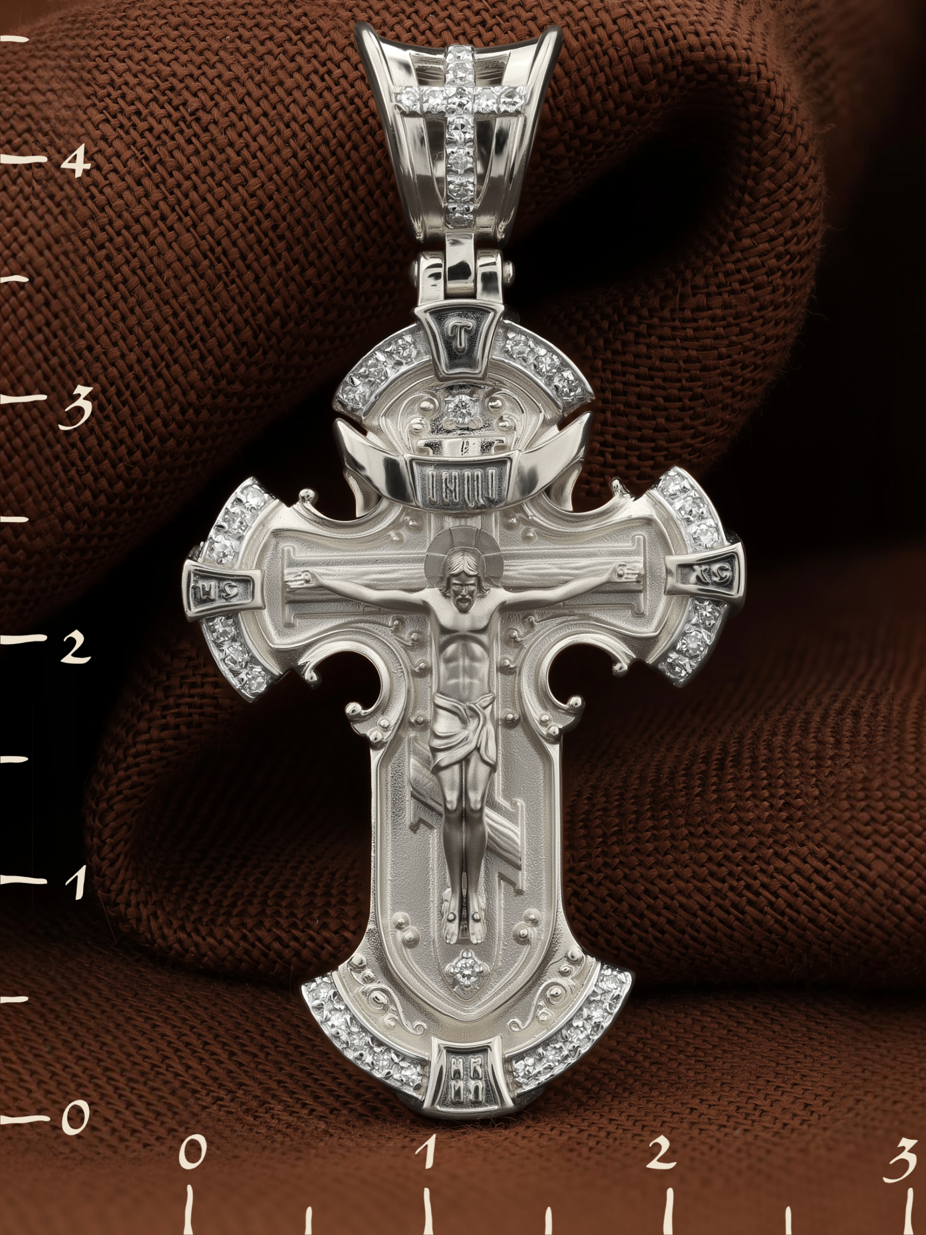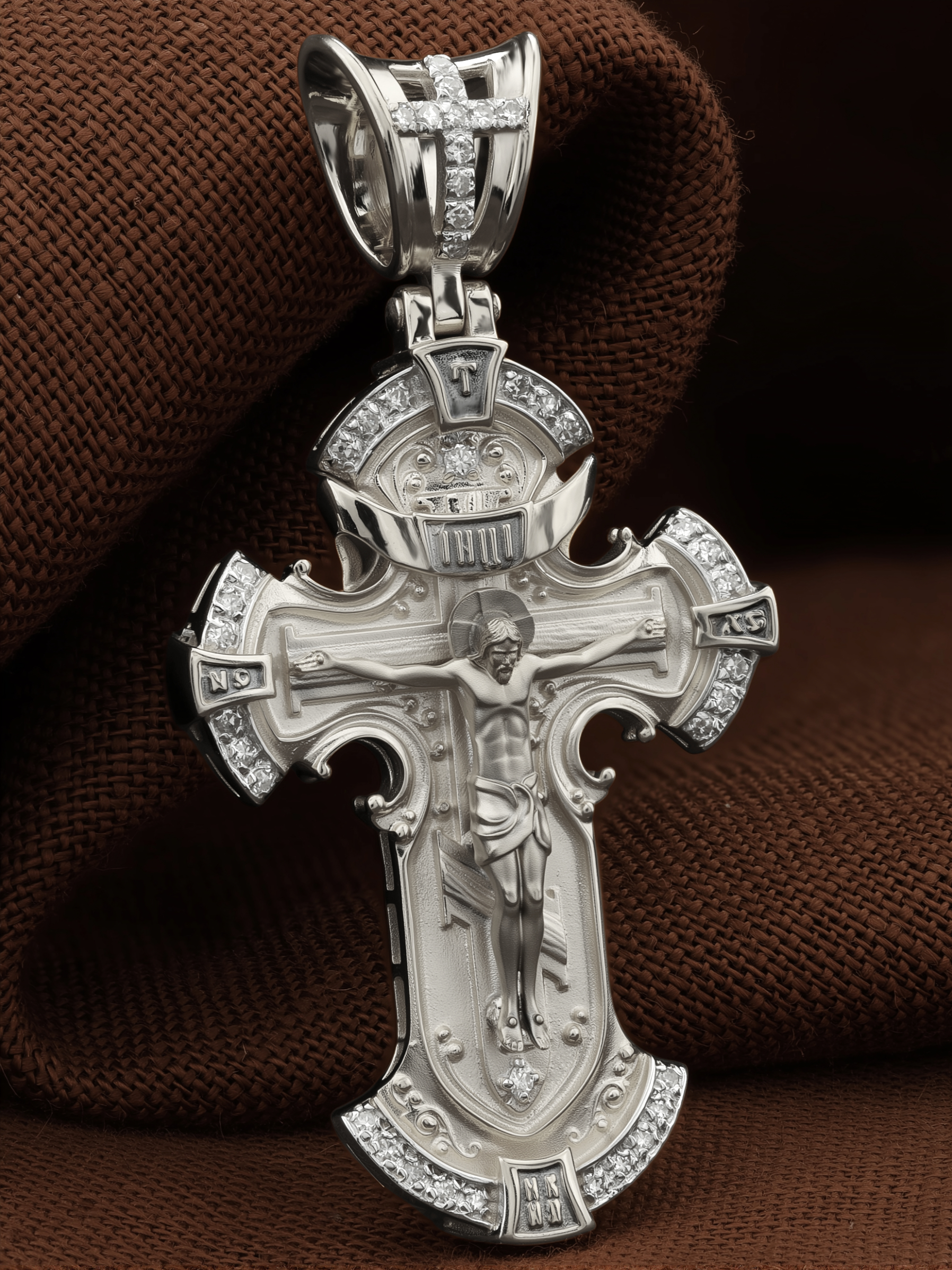 На лицевой стороне креста изображено Распятие Господа и Спасителя нашего Иисуса Христа, отдавшего Себя на смерть, для искупления грехов мира. Крест является символом жертвенной любви Всеблагого Бога к падшим людям, всепобеждающим духовным оружием христиан, основанием и средоточием церковной жизни. Господь сказал: кто хочет идти за Мною, отвергнись себя, и возьми крест свой, и следуй за Мною. (Мк. 8: 34). Верхняя перекладина символизирует титло — табличка, на которой, согласно Евангелию, было начертано: Иисус Назорей Царь Иудейский (IНЦI). Справа и слева от Распятия изображены символы «IС ХС» — святое имя Христа. Внизу креста написано слово «НИКА», что значит «победитель». В верхней части креста обозначена буква «Т», которая символизирует одно из орудий страданий Господа — трость.