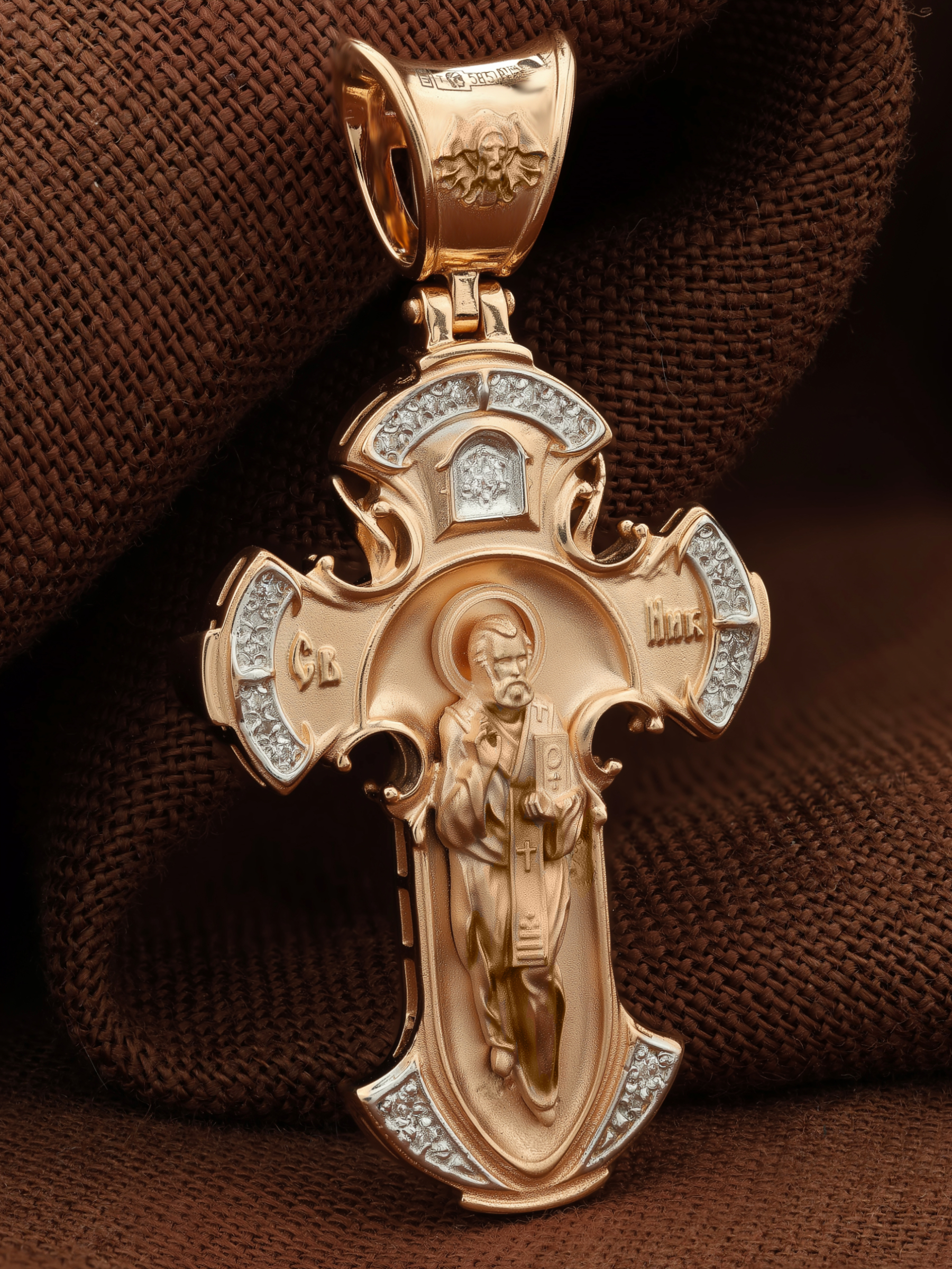 Оборотную сторону креста возглавляет икона святителя Николая Чудотворца. На кулонном кольце помещено изображение Спаса Нерукотворного — образ Спасителя, который Он запечатлел на плате и передал для исцеления больному проказой царю Эдессы. ему придается победное и защитное значение.