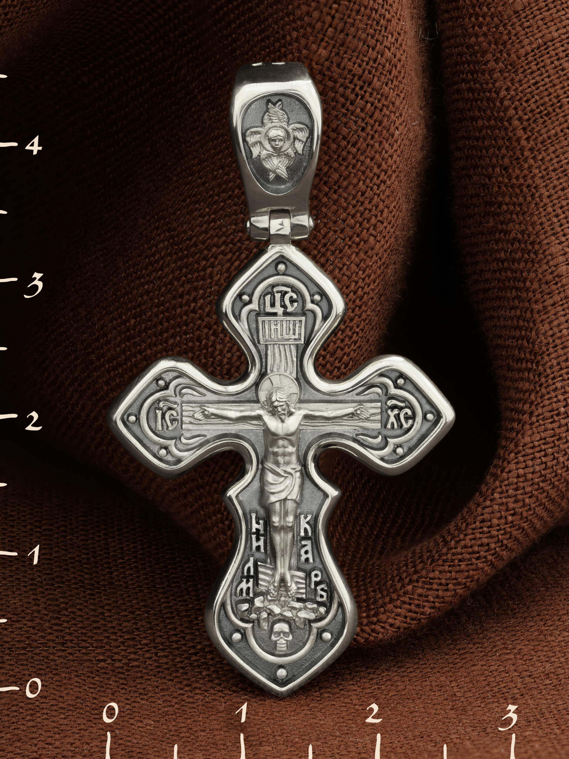 Господь на кресте изображен свободно покоящимся с простертыми руками, как бы обнимающим всю Вселенную. Он — Спаситель, поправший смертию смерть и призывающий к Себе «все концы земли», поэтому рядом с Господом написано «НИКА», что значит «победитель». Это слово Господь произнес по воскресении, обращаясь к ученикам: «Дерзайте, яко Аз победил мир». По бокам простертых рук Господа написаны титлы Его Святого имени «IC XC», а в верхней оконечности креста написаны буквы «ЦС», что значит «Царь Славы». В основании креста в виде скалистого пригорка изображена гора Голгофа с черепом Адама, обозначенная на кресте буквами «МЛРБ» (Место лобное Рай бысть»).