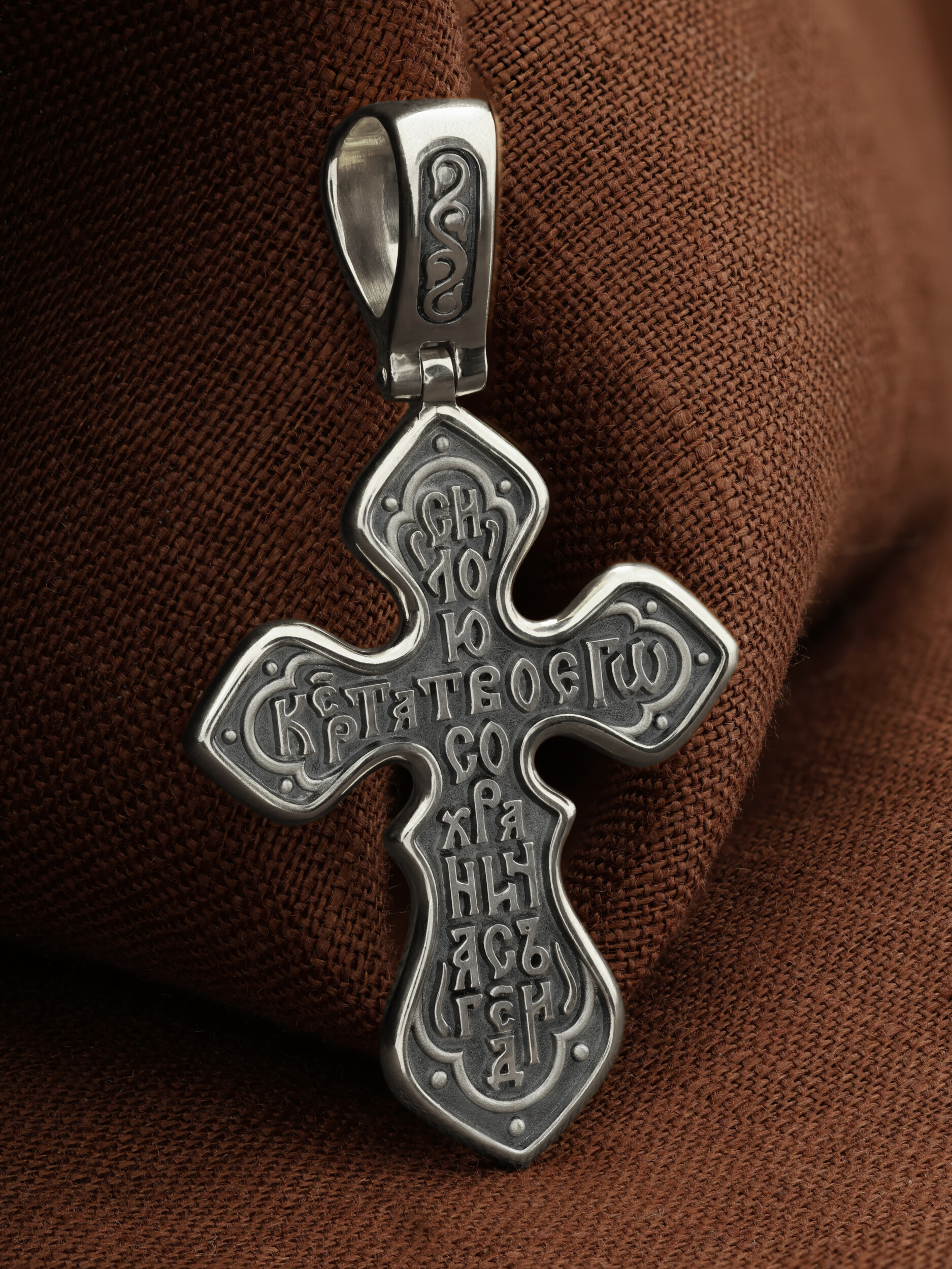 Все пространство оборотной стороны креста занято молитвенным обращением: «Силою Креста Твоего сохрани нас, Господи!»