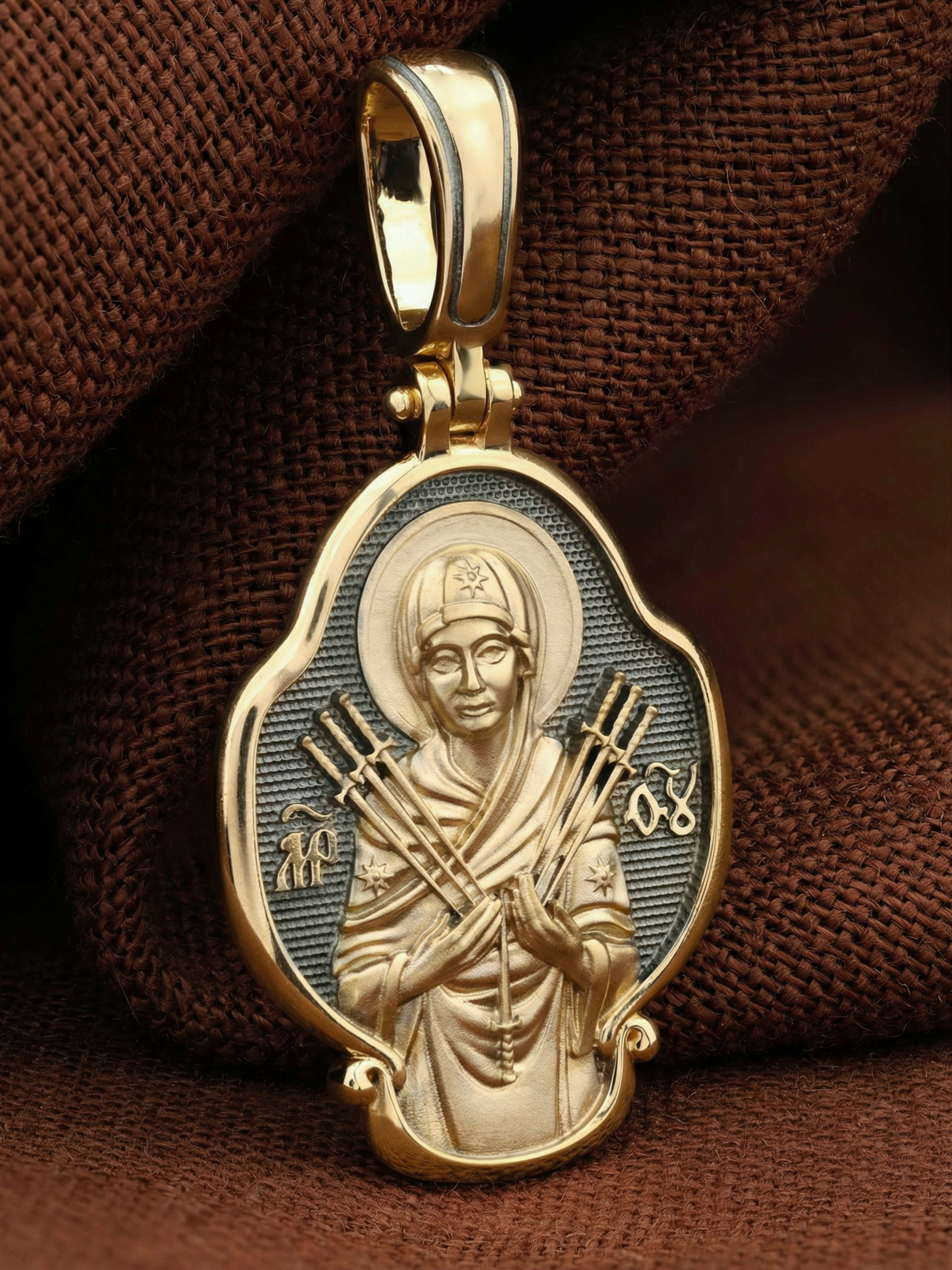 На лицевой стороне образка изображена икона Пресвятой Богородицы «Семистрельная» — одна из самых чудотворных икон на Руси. На протяжении многих веков христиане взывали к Царице Небесной через эту икону, если в стране начинались войны или мятежи.
