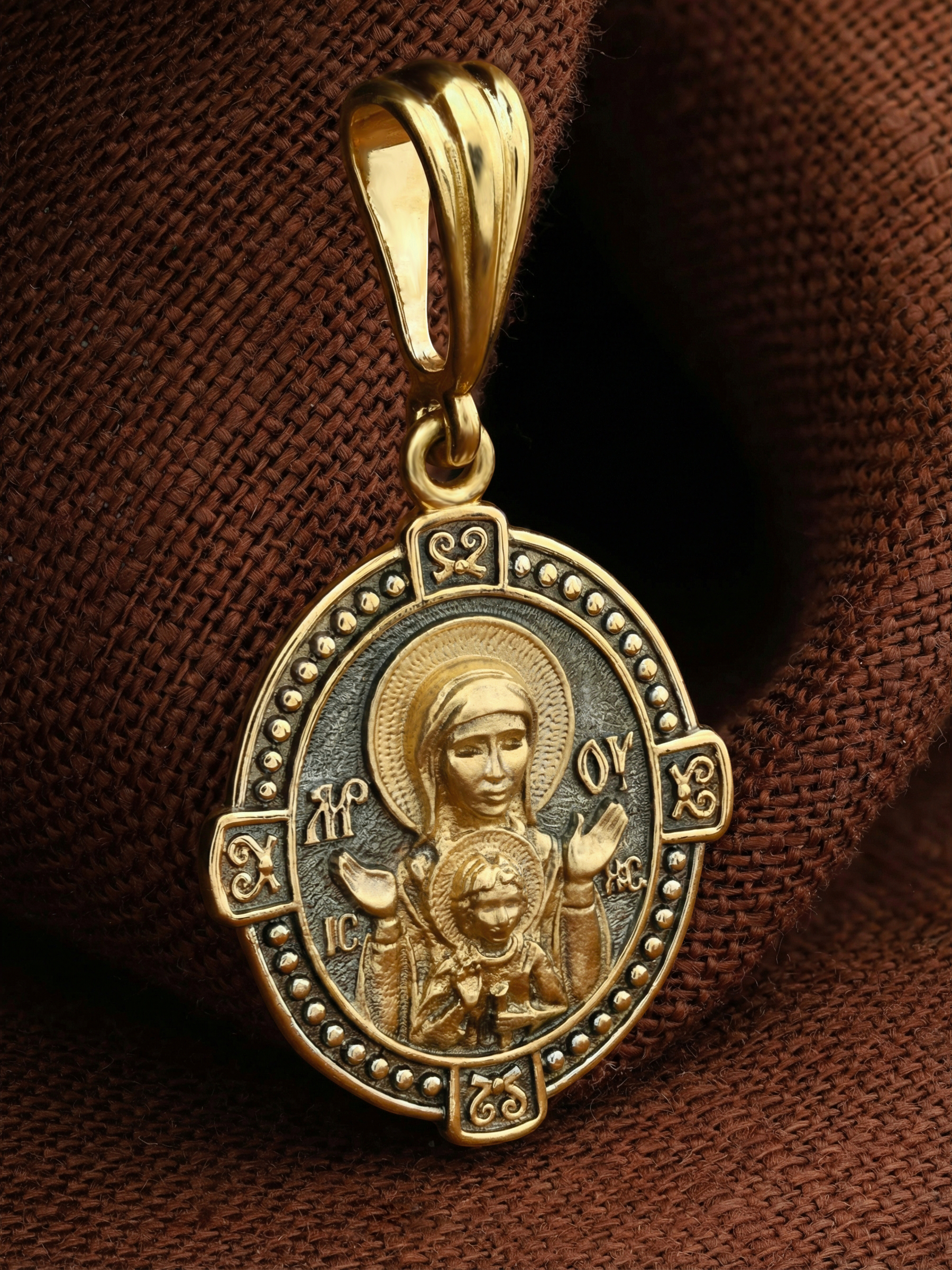 В центр образка помещен образ Божией Матери «Знамение», прославившийся многими чудесами в Новгороде в XII веке. Икона эта чтится как одна из самых великих святынь Русской земли. Молитвенно воздетые руки Богородицы означают заступничество за людей пред Богом. Рядом с Ней, на фоне круглого щита, — благословляющий Божественный Младенец — Спас-Эммануил.