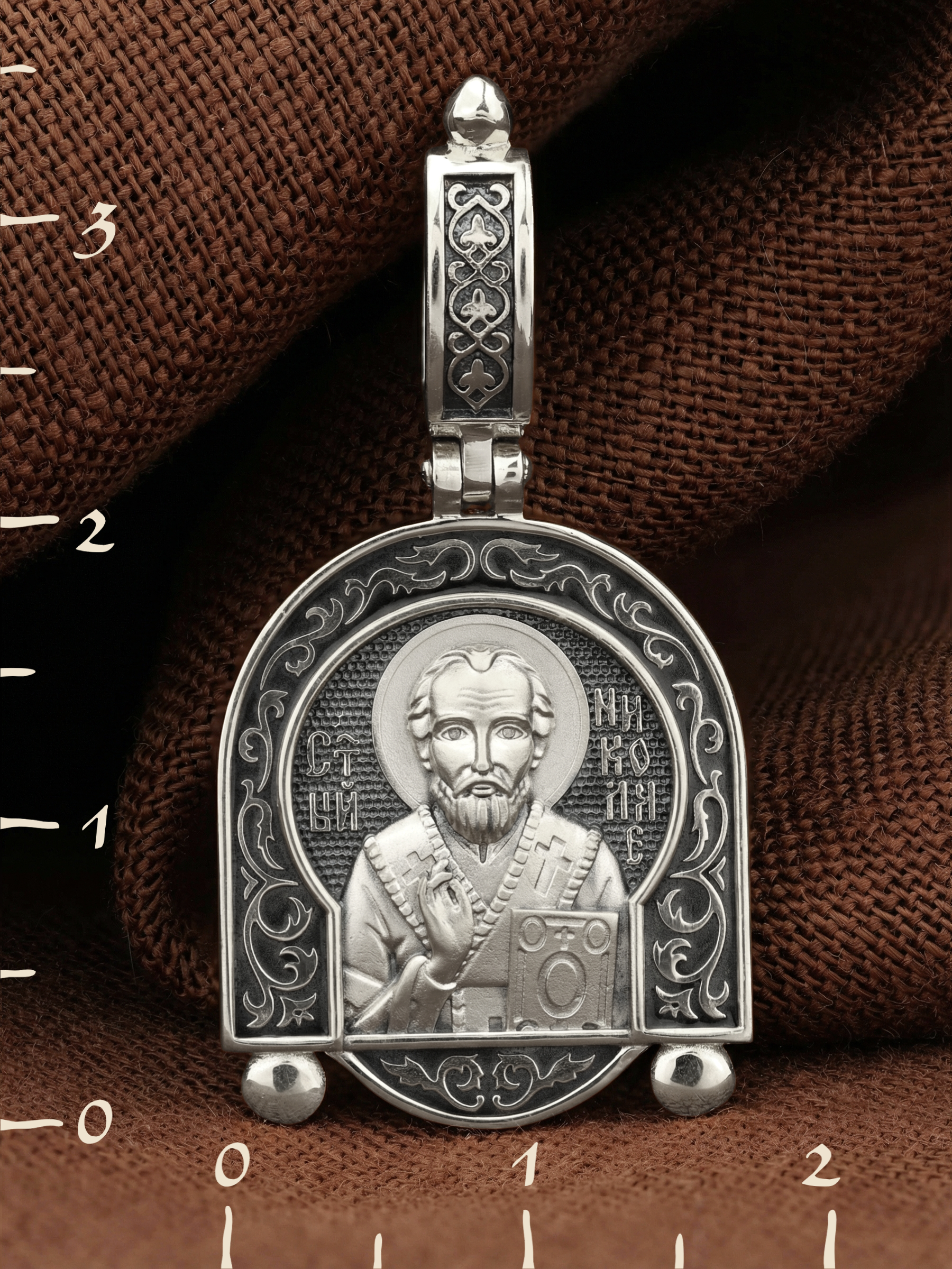 На лицевой стороне образка изображен Святитель Николай архиепископ Мир Ликийских, Чудотворец. Он является одним из самых почитаемых святых в православном мире. Святитель Николай родился во второй половине III века в Малой Азии в Ликийском городе Патары. С рождения Божий Угодник проявлял необыкновенные дарования. Сохранилось Предание, что во время крещения он, никем не поддерживаемый, простоял в купели три часа. Приняв сан священника, святитель Николай стал проводить еще более строгую подвижническую жизнь. Избранник Божий Николай стал вершиной всех добродетелей, поднятой до райской высоты. С кем из величайших праведников не сравнялся он образом духовной красоты, кому из них не последовал в своих деяниях и чудотворениях? Вся жизнь святого Николая — это служение Богу. Много великих и преславных чудес сотворил великий Святитель Николай Угодник. Он помогал сущим в бедах, укрощал штормы, спасал от потопления и выносил на сушу из глубины морской, освобождал из плена и приносил освобожденных домой, избавлял от уз и темницы, защищал от посечения мечом, освобождал от смерти и подавал многим различные исцеления: слепым — прозрение, хромым — хождение, глухим — слух, немым — дар слова.