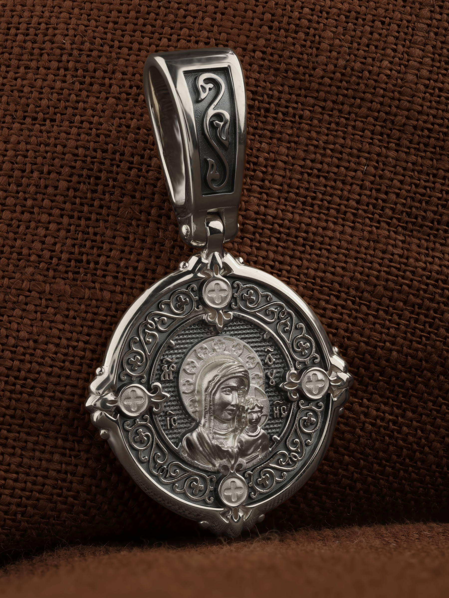 На лицевой части образка изображена Казанская икона Пресвятой Богородицы — одна из самых почитаемых в России чудотворных икон Богородицы. Богословское значение Казанской иконы — указать верующим истинный Путь к спасению, который лежит через Христа. Только Божия Матерь имеет настолько сильное дерзновение к Спасителю, что может ходатайствовать перед Ним за всех верных. Именно этот образ дарится новой повенчанной паре, как хранитель очага и семейная реликвия. Молитва перед Казанской иконой Божьей Матери помогает во всех сложных случаях жизни, в болезнях, во всех печалях, невзгодах, скорбях. Уникальная история появления, чудеса, случившиеся по молитвам православных людей возле образа — все это делает Казанскую Богородицу особенной, среди тысяч других икон.