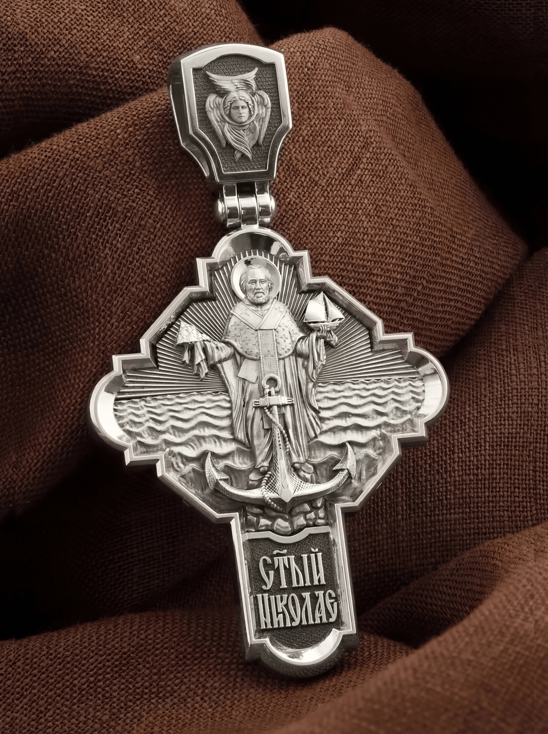 На лицевой стороне креста изображено Распятие Господа и Спасителя нашего Иисуса Христа, отдавшего Себя на смерть, чтобы другие могли жить — жить вечной жизнью, жить с Богом. Своею кровью Господь освятил крест и сделал его проводником Своей благодати, источником освящения верующих. На верхней табличке, выше головы Иисуса, расположена надпись, составленная Понтием Пилатом — «ИНЦИ». Она означает «Иисус Назорей, Царь Иудейский». Надпись «IС ХС» означает Иисус Христос помещается на разных сторонах поперечной (большой) перекладины креста. На кулонном кольце помещено изображение Духа Святого в виде голубя, сходящего с Небес