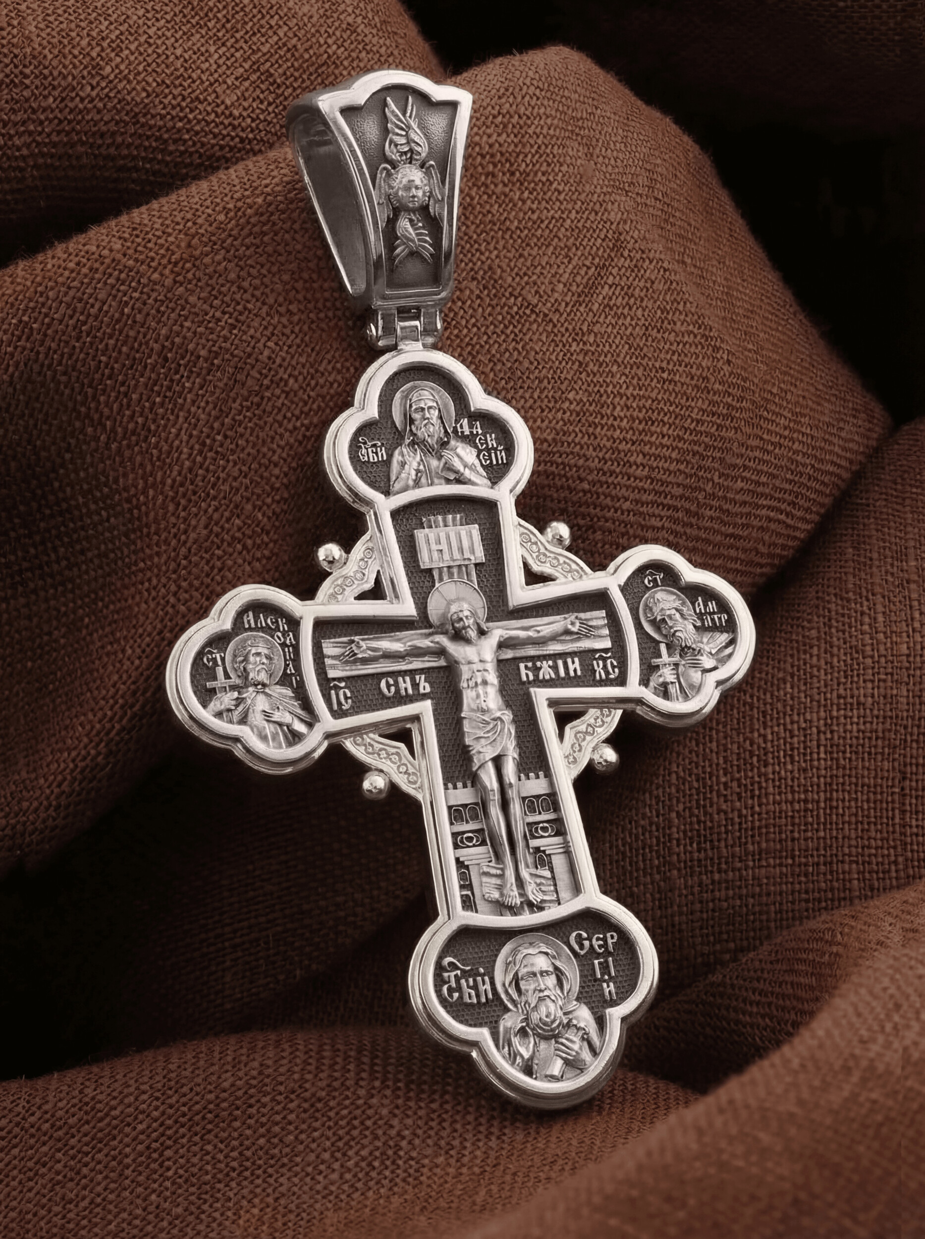 На лицевой стороне креста в центре изображено Распятие Господа Иисуса Христа. Слева от Господа находится святой благоверный князь Александр Невский, справа — святой благоверный князь Димитрий Донской. Святые князья почитаются как покровители воинов и защитники от врагов телесных и душевных. Вверху и над Распятием — образ митрополита московского святителя Алексия. Он почитается как помощник в воспитании детей и целитель, особенно при болезни глаз. Внизу — икона преподобного Сергия Радонежского, великого чудотворца и целителя. К нему обращаются в различных болезнях, тяжелых жизненных ситуациях, а также когда у детей возникают сложности в обучении.