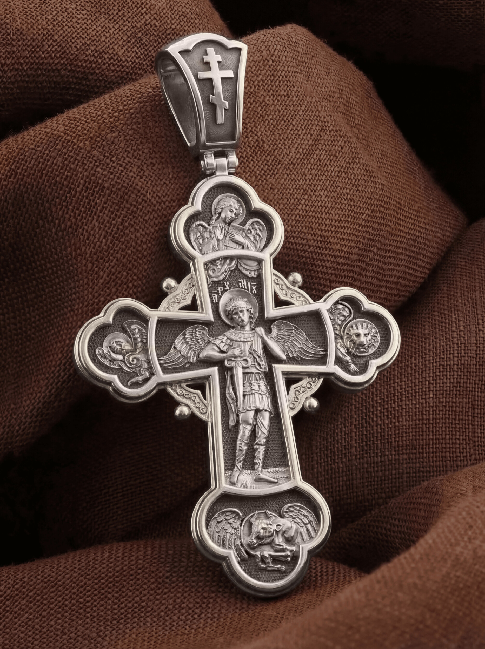В центре оборота креста изображен Архистратиг Михаил. Могучий Архангел почитается как покровитель воинов и всех верных Богу и ведущих борьбу против сил зла, а также защитник душ умерших, страж райских врат. Над ним благословляющая десница — знак присутствия Бога. Архангел изображен в окружении символов четырех евангелистов: орел (Иоанн), лев (Марк), телец (Лука) и ангел (Матфей).