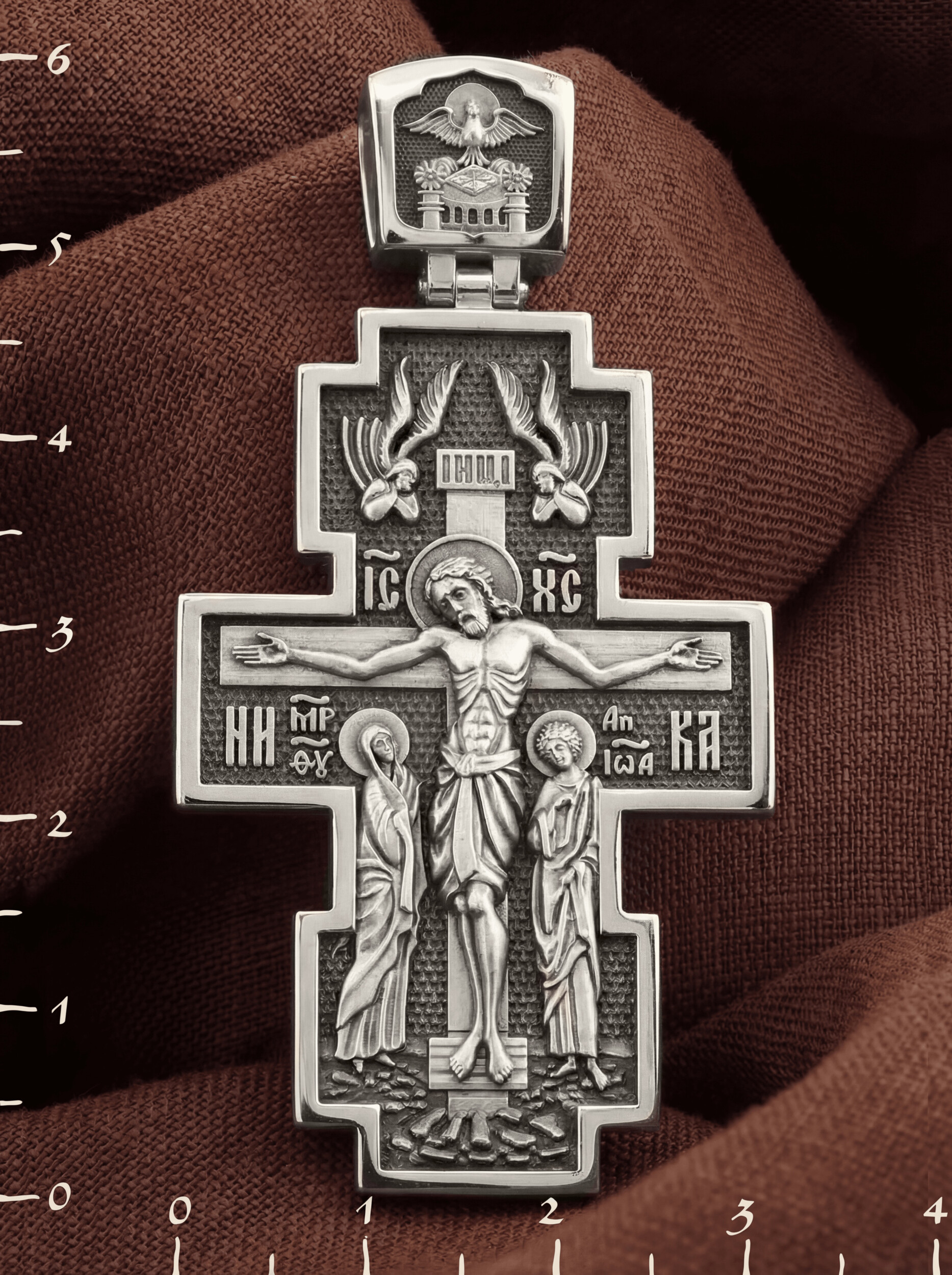 На лицевой стороне креста изображено Распятие Христово — величественный, торжественный образ христианства, знак победы над смертью. Христос, принеся Себя в Жертву на Кресте, искупил грехи всего мира и дал людям возможность обрести спасение. Слева и справа от Креста стоят Богоматерь и апостол Иоанн Богослов. По преданию, именно они до последнего не оставляли Спасителя в Его страданиях, были с Ним до самой смерти. Во главе образка изображен парящий голубь — символ Святого Духа и Его благодати. Сверху над Распятием парят Ангелы. Они изображены летящими с Небес вниз, к Кресту. Ангелы словно поддерживают табличку над головой Спасителя, на которой написано IНЦИ — «Иисус Назарянин Царь Иудейский». Эта табличка — титло — была приколочена римскими палачами как указание на «вину» Христа, то, за что Он был казнен.