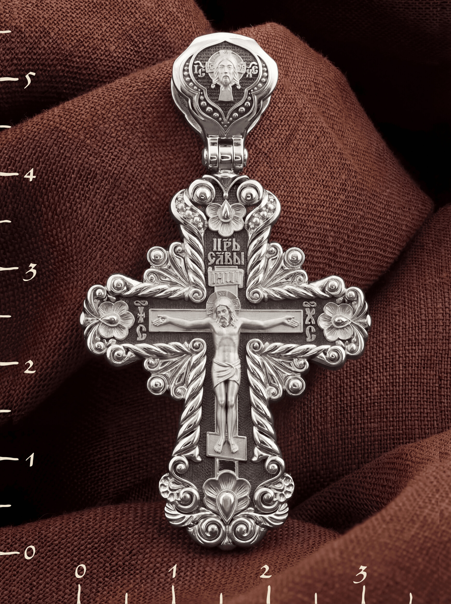 На лицевой стороне креста изображено Распятие Господа и Спасителя нашего Иисуса Христа, отдавшего Себя на смерть, для искупления грехов мира. Крест является символом жертвенной любви Всеблагого Бога к падшим людям, всепобеждающим духовным оружием христиан, основанием и средоточием церковной жизни. Господь сказал: кто хочет идти за Мною, отвергнись себя, и возьми крест свой, и следуй за Мною. (Мк. 8: 34). Над Распятием помещена надпись «Царь Славы». На верхней табличке, выше головы Иисуса, расположена надпись, составленная Понтием Пилатом — «IНЦI». Она означает «Иисус Назорей, Царь Иудейский». Надпись «IC» «ХC», означает Иисус Христос, помещается на разных сторонах поперечной перекладины креста. На кулонном кольце изображен Нерукотворный образ Господа и Спасителя нашего Иисуса Христа, чудесно отпечатавшийся на плате, которым Христос вытер свой лик.