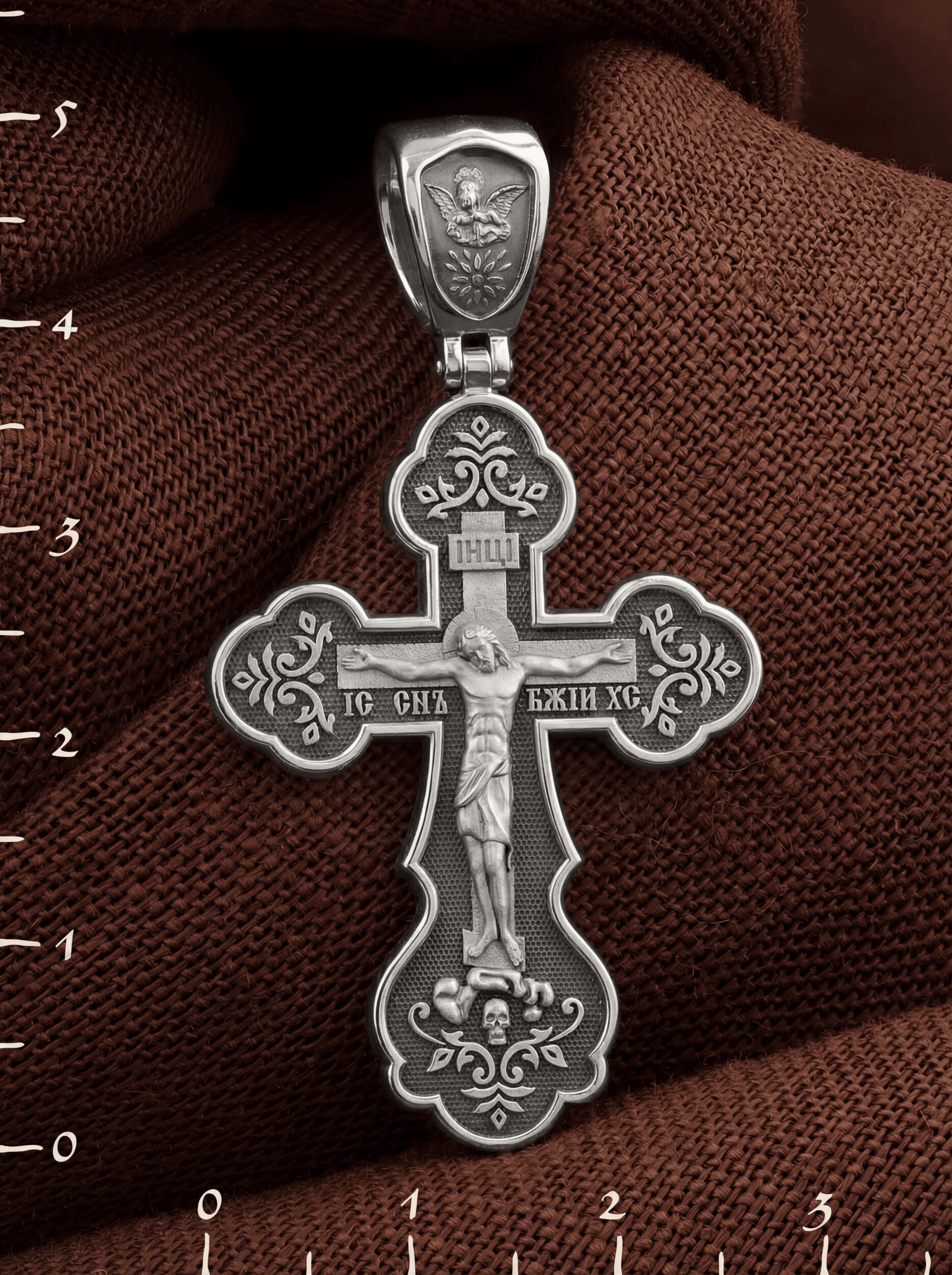 Верхняя часть креста, лицевой стороны, область Божественного бытия, как бы отделяется короткой верхней перекладиной. Эта перекладина изображает табличку с надписью в виде аббревиатуры IНЦI — «Иисус Назорей Царь Иудейский», которая, согласно Евангелию, была прибита к кресту после Распятия. Внизу, в земной части креста, под ногами Христа изображается наклоненная перекладина. Это подножие, символизирующее мерило дел человеческих, в чаши которого на Страшном Суде будут полагаться добрые и злые дела людей. Один из распятых с Христом разбойников хулил Господа, и мерило склонилось под тяжестью его грехов, как бы низводя его в ад. Другой же каялся и просил у Господа милости. Ему подножие указывает на Царство Небесное.