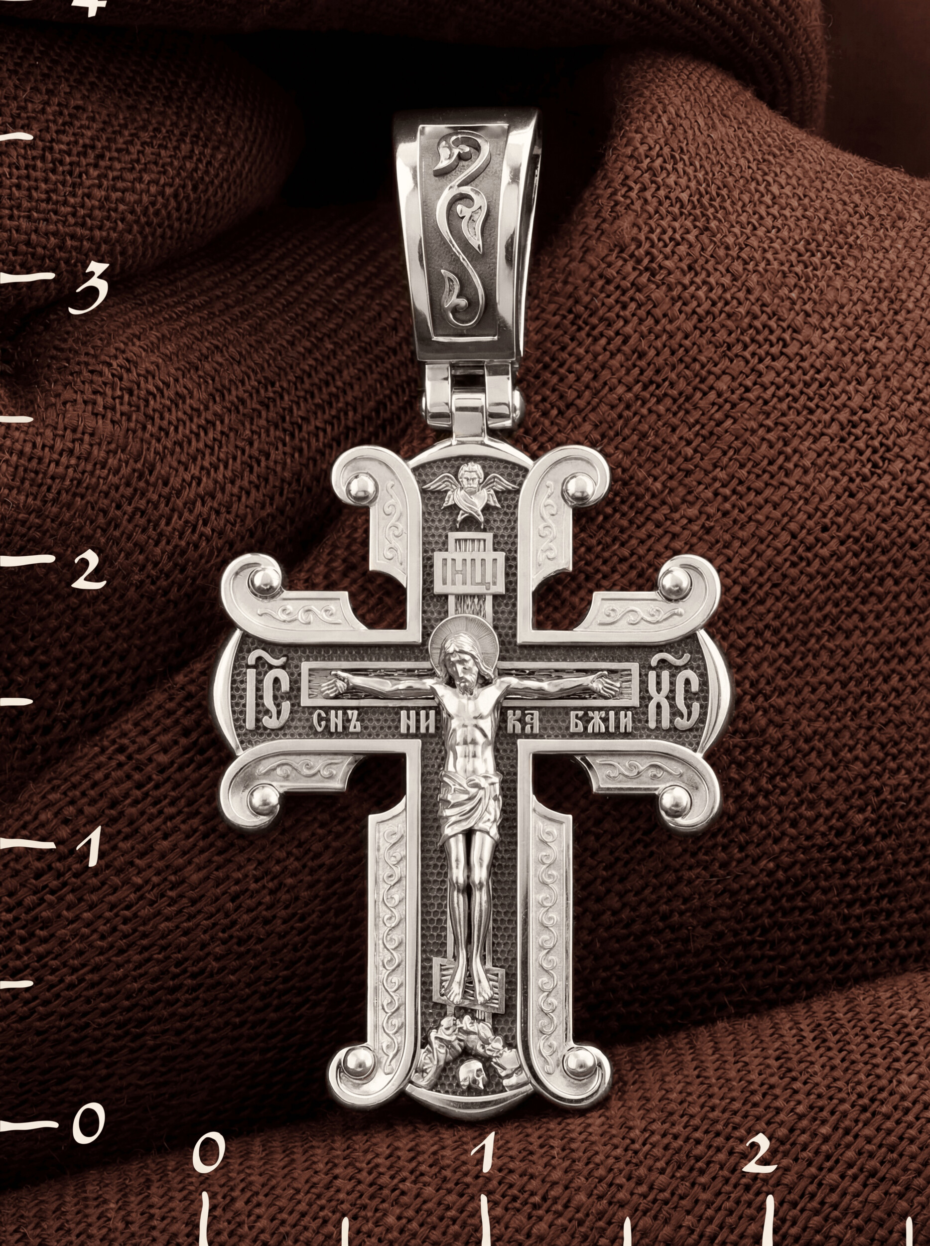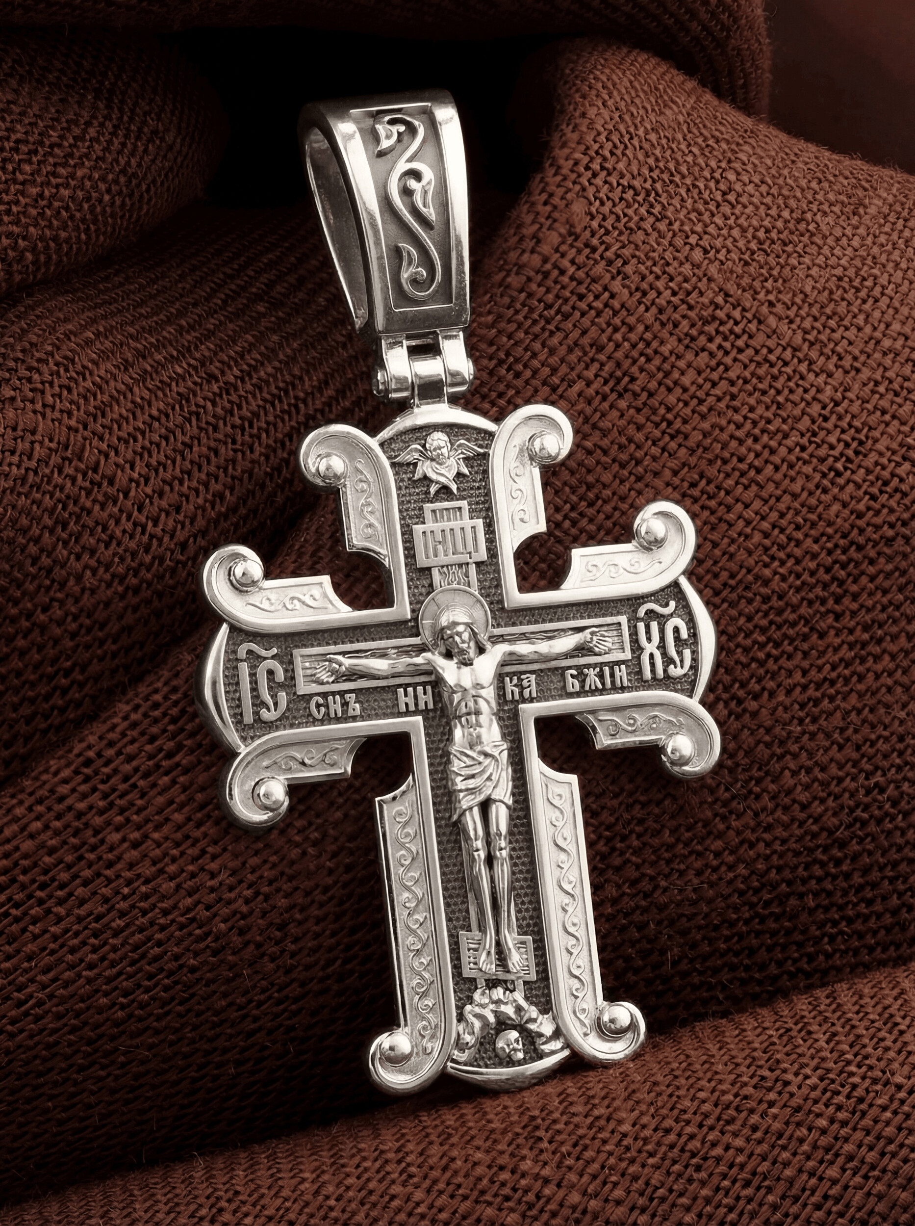 На лицевой стороне необычной формы нательного креста мы видим распятие Господне. Сам крест украшен плетением полурастительной тематики и золотым ободком, заканчивающимся завитками. На ухе с лицевой стороны надпись — Царь Славы. Под ней — шестикрылый огненный серафим, и буквы «IНЦI», означающие Иисус Назорей Царь Иудейский. С обеих сторон горизонтальной перекладины надписи — монограмма святого имени Христа — «ИС ХС», а под ней — «НИКА» (Победитель) и «Сын Божий». В подножии мы видим изображенную гору Голгофу в виде скалистой горки с Главой Адамовой в пещере.