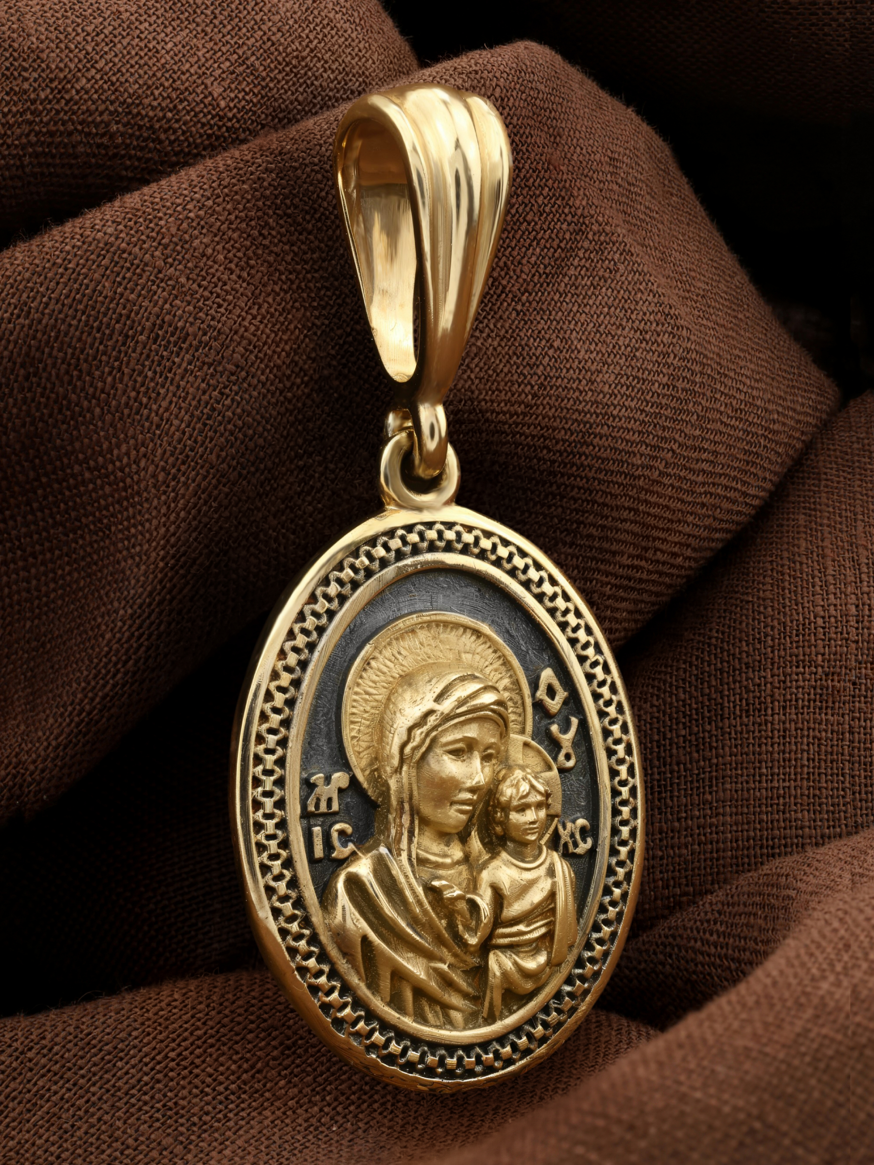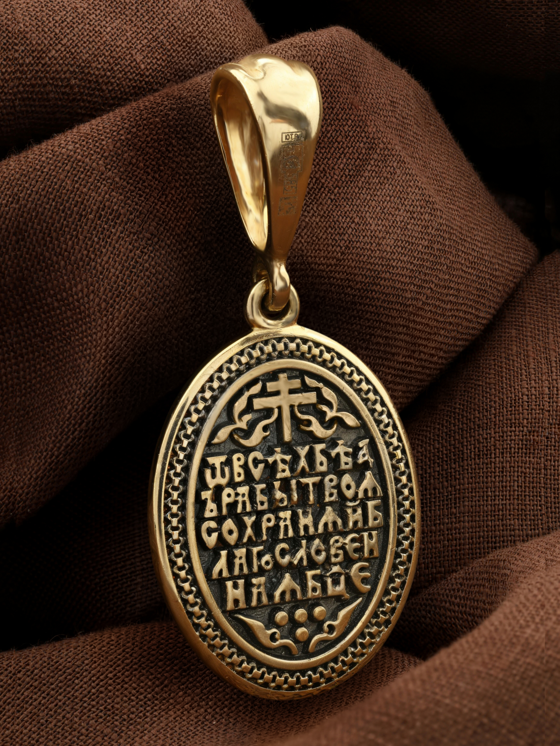 На лицевой части образка изображена Казанская икона Пресвятой Богородицы — одна из самых почитаемых в России. Икона была явлена на пожарище в Казани в 1579 году. В 1904 году святыня была похищена и уничтожена, но чудотворную силу иконы Богородица явила во многих ее списках. Молитва перед Казанской иконой Божьей Матери помогает во всех сложных случаях жизни, во всех печалях, невзгодах, скорбях.