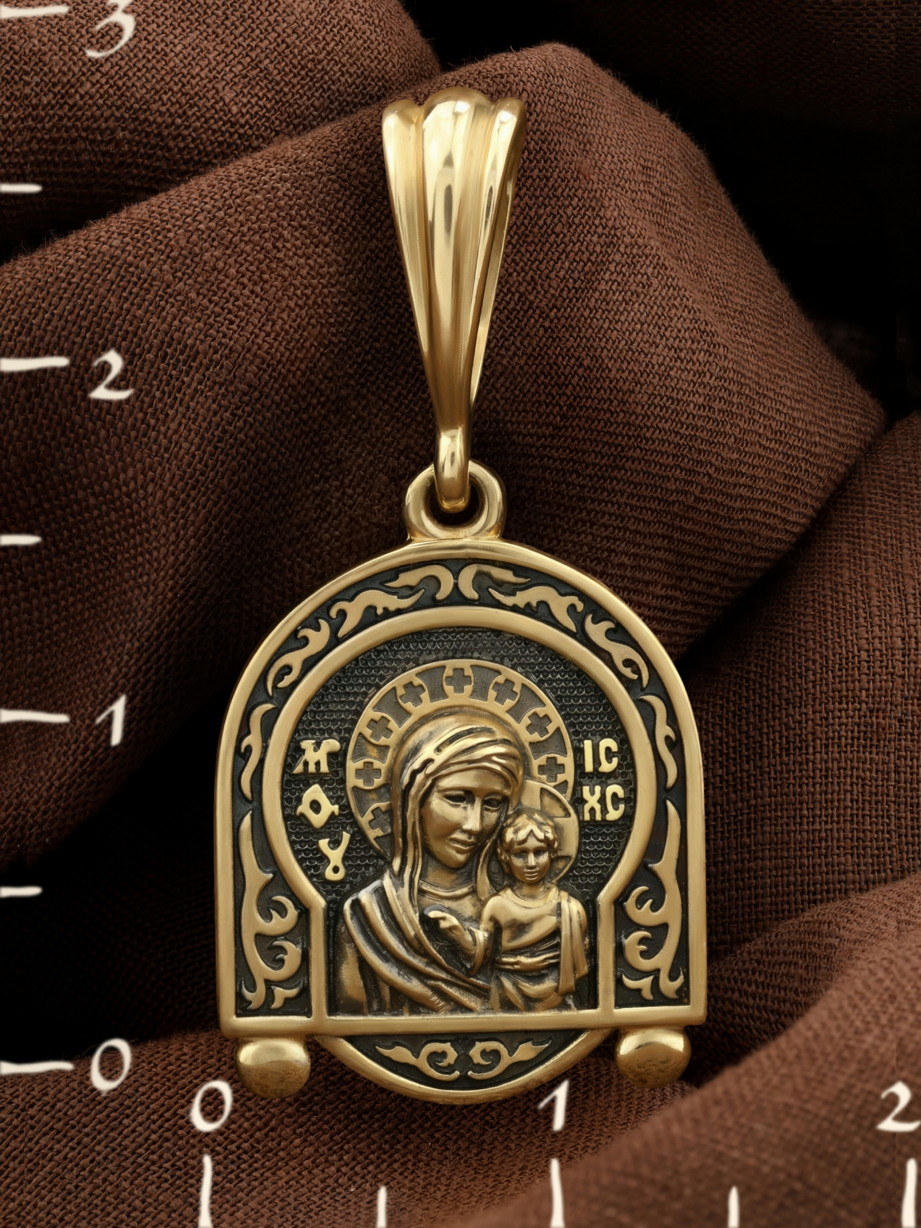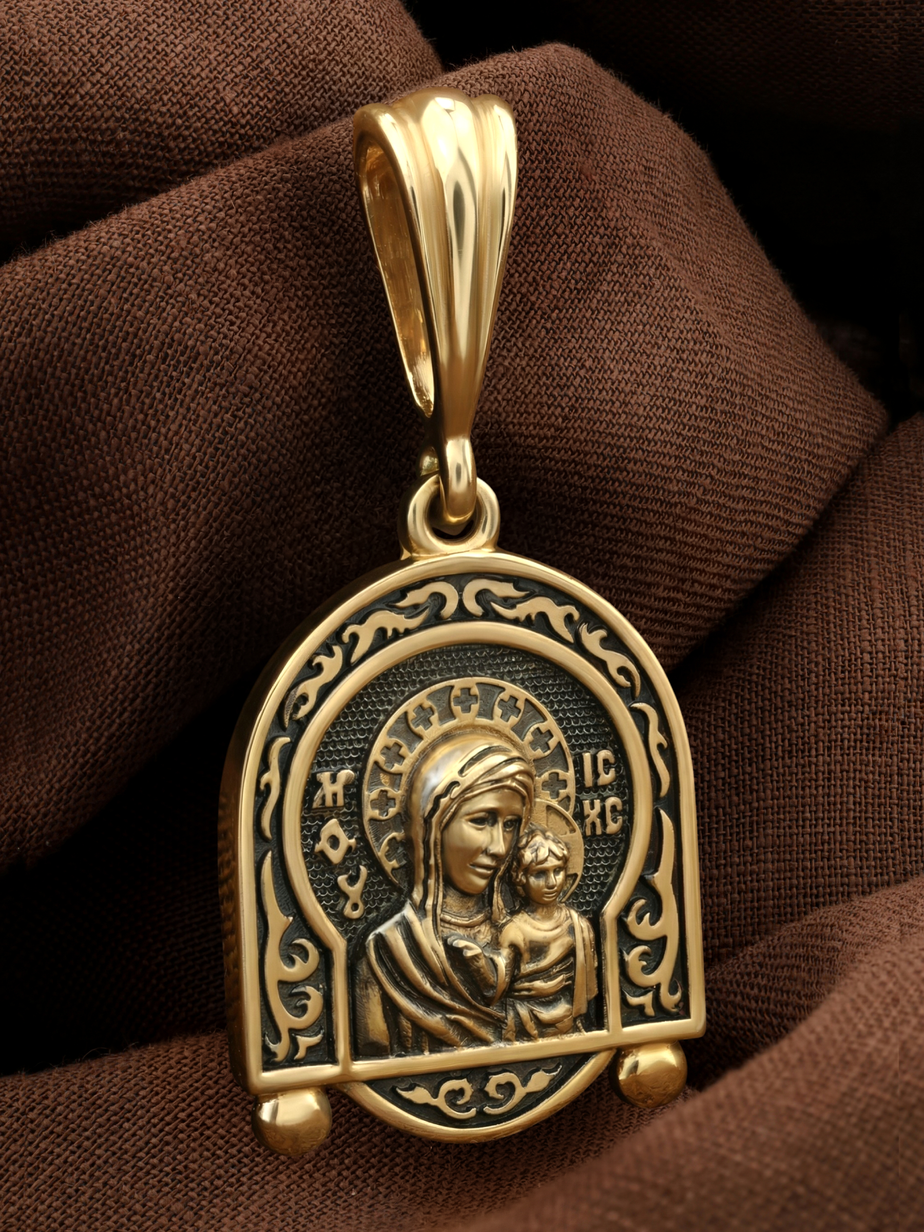 На лицевой части образка изображена Казанская икона Божией Матери — одна из самых почитаемых в России чудотворных икон Богородицы. Богословское значение Казанской иконы — указать верующим истинный Путь к спасению, который лежит через Христа. Только Божия Матерь имеет настолько сильное дерзновение к Спасителю, что может ходатайствовать перед Ним за всех верных. Именно этот образ дарится новой повенчанной паре, как хранитель очага и семейная реликвия. Молитва перед Казанской иконой Божьей Матери помогает во всех сложных случаях жизни, в болезнях, во всех печалях, невзгодах, скорбях. Уникальная история появления, чудеса, случившиеся по молитвам православных людей возле образа — все это делает Казанскую Богородицу особенной, среди тысяч других икон.