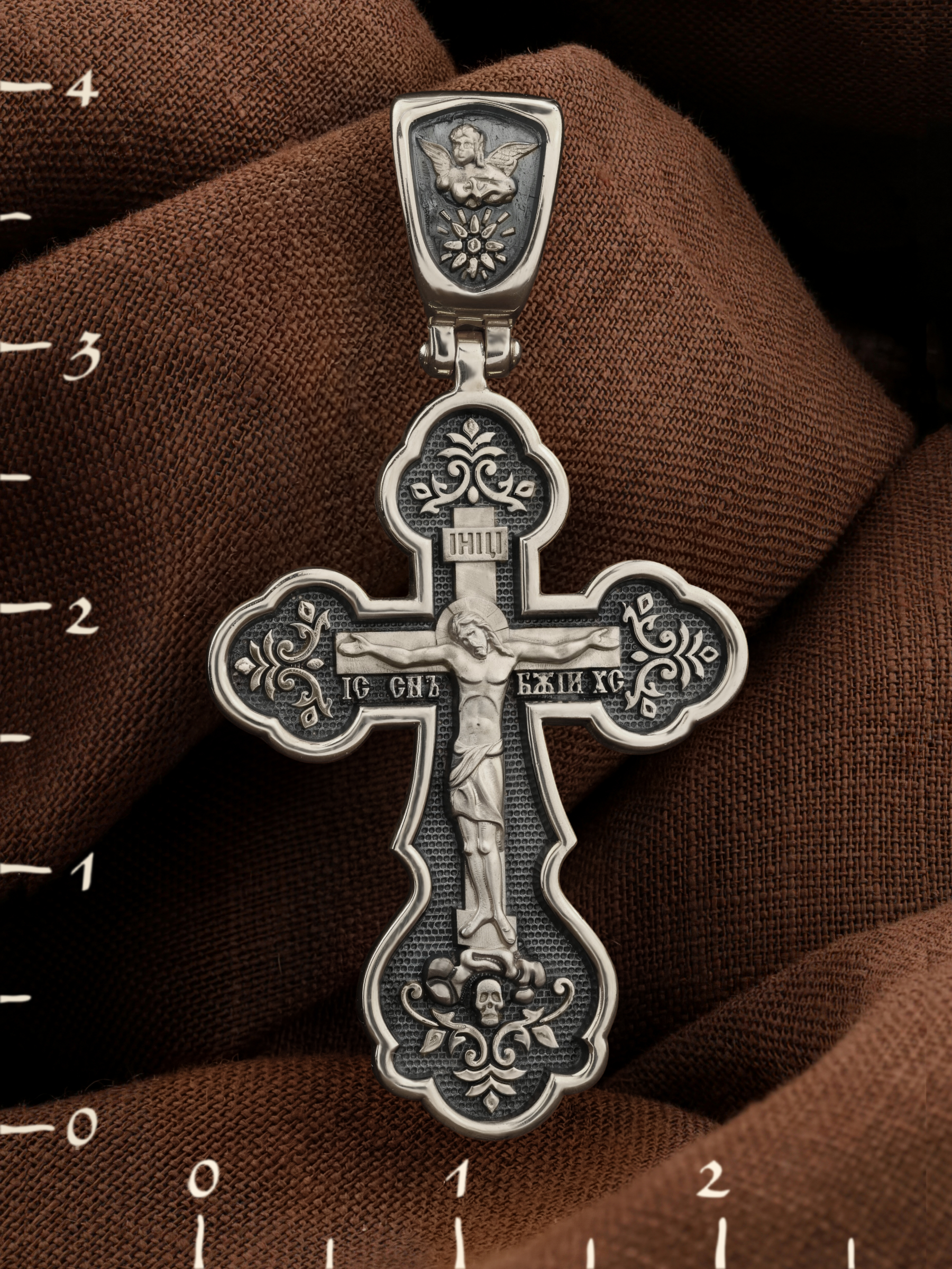 На лицевой стороне креста изображено Распятие Господа и Спасителя нашего Иисуса Христа. Христос, подвергнутый на кресте мучительной казни, своими страданиями искупил нас от древнего греха и даровал нам жизнь вечную. Крест означает своей вертикальной прямой линией справедливость и непреложность Божественных заповедей, прямоту Божией правды и истины, не допускающей никаких нарушений. Эта прямота пересекается главной поперечной перекладиной, означающей любовь и милость Божию к падшим и падающим грешникам, ради которой и был принесен в жертву Сам Господь, взявший на Себя грехи всех людей. На верхней табличке, выше головы Иисуса, расположена надпись, составленная Понтием Пилатом — «IНЦI». Она означает «Иисус Назорей, Царь Иудейский». Надпись «IС ХС» означает Иисус Христос и словосочетание «СЫН БОЖИЙ», что означает божественную природу Иисуса Христа, помещается на разных сторонах поперечной перекладины креста. Крест стоит на горе камней, символизирующих Голгофу. Под подножием Креста изображена покоящаяся голова (череп) Адама, грехи которого Христос омыл Своею Кровью. Христос в Своей Божественной любви, над которой смерть не властна и которая, страдая, и не страдает в обычном смысле, простирает к людям со Креста Свои объятия, в которые призывается и привлекается весь мир. Поэтому Тело Его не висит, а торжественно покоится на Кресте. Здесь Христос, распятый и умерший, удивительным образом жив в самой смерти Своей. На кулонном кольце изображен Ангел Херувим. Херувимы сияют всегда светом Богопознания, ведением таин и глубин премудрости Божией, сами просвещаемые и других просвещающие.
