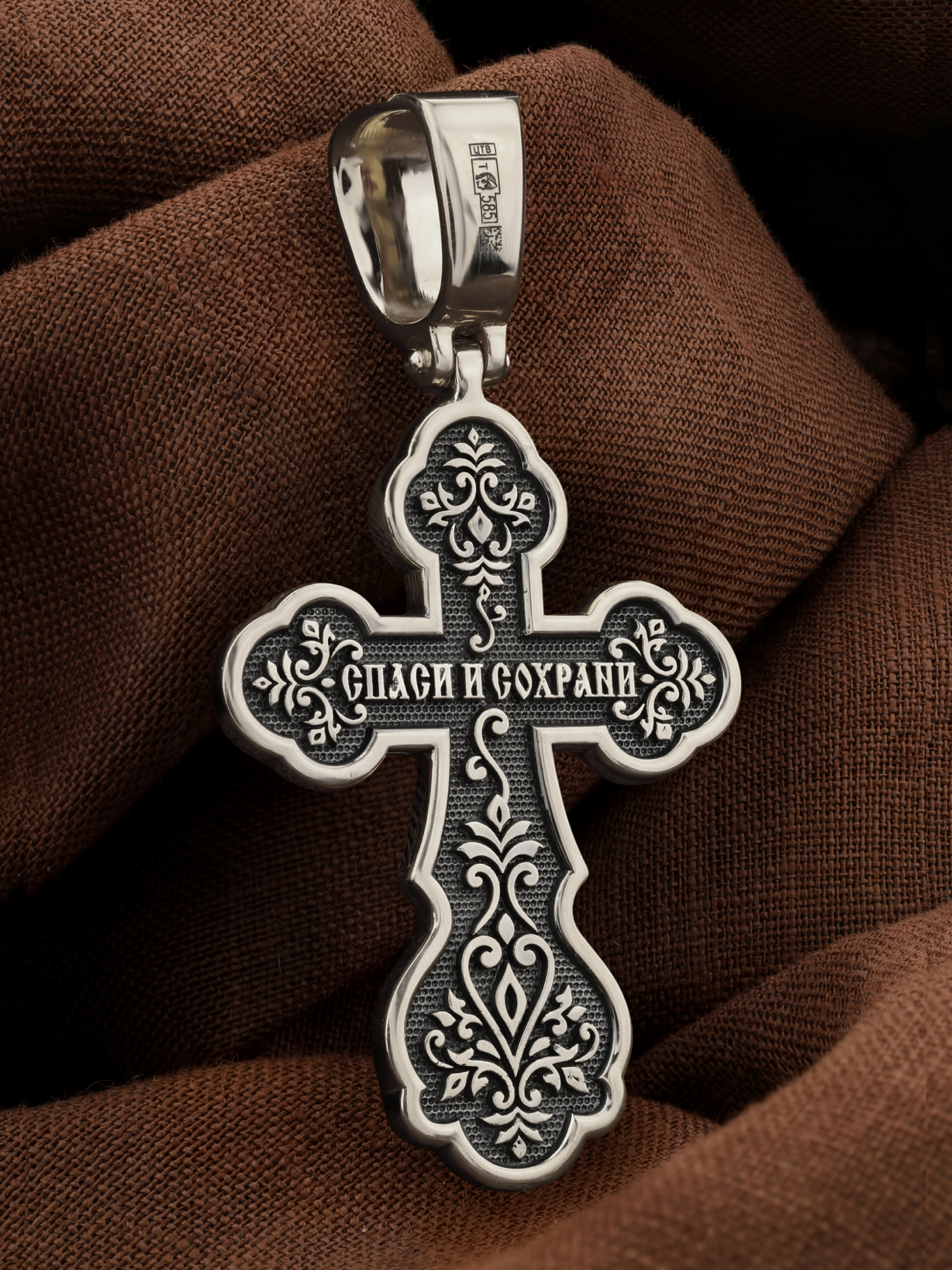 На оборотной стороне креста помещена молитва обращенная к Господу: «Спаси и сохрани». Крест украшен растительным орнаментом.