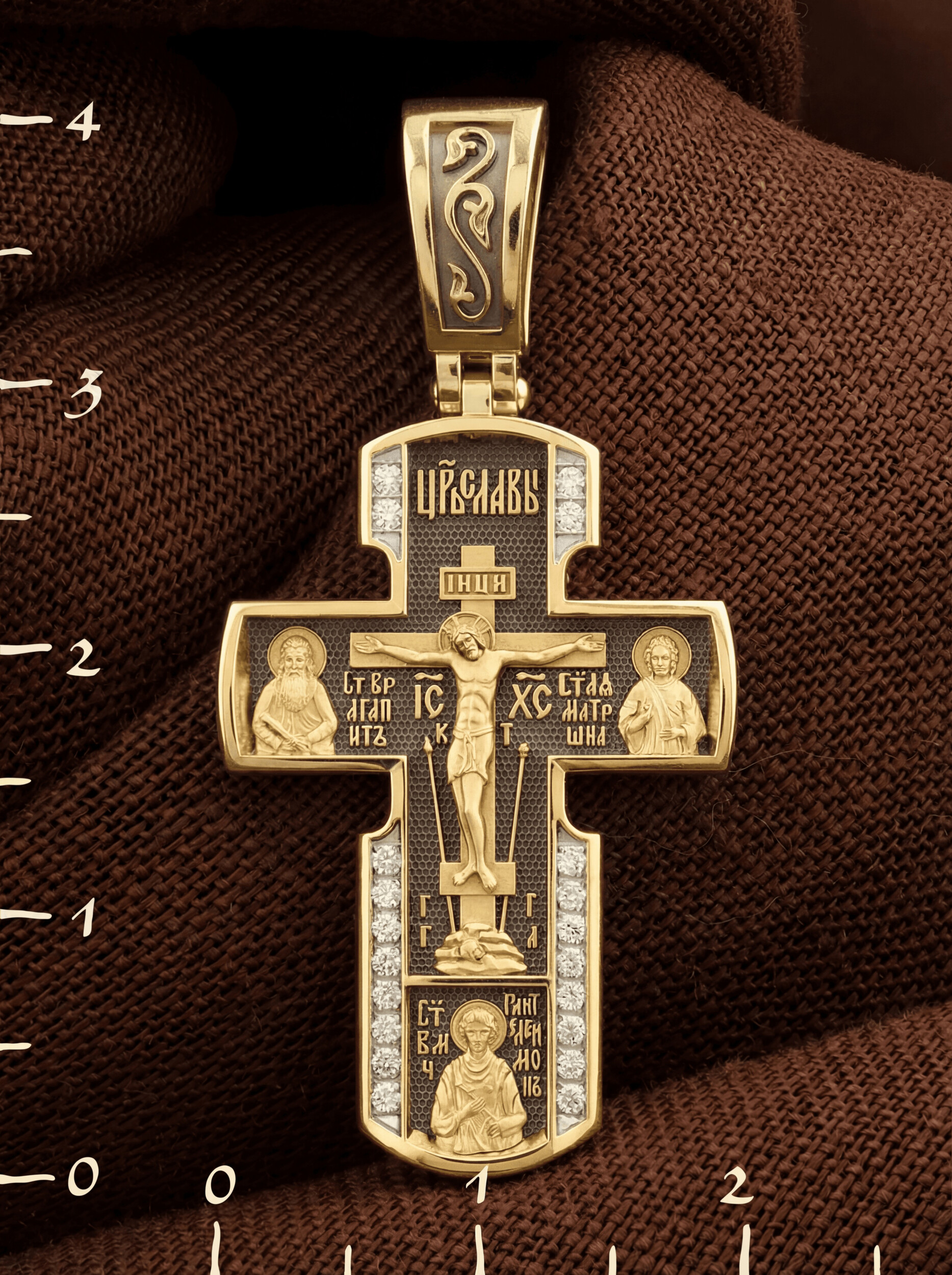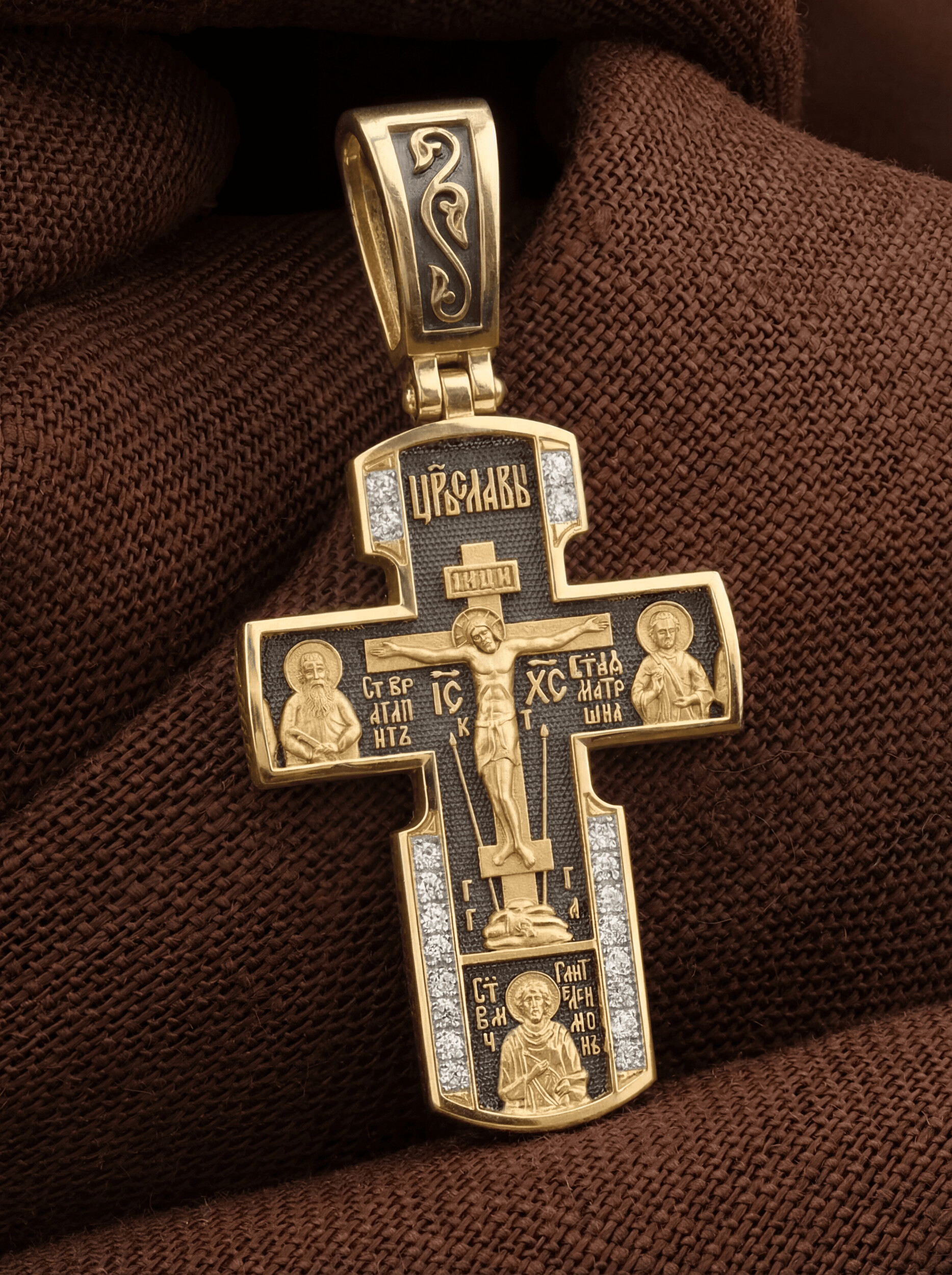 На лицевой стороне креста изображено Распятие Иисуса Христа на Голгофском Кресте, над вершиной которого помещена надпись «Царь Славы». Справа от Распятия помещен образ прославленной святой блаженной Матроны. «Матронушка», — ласково называют эту святую православные за удивительную любовь и помощь, которую она подает всем нуждающимся в ее поддержке. Слева — икона прп. Агапита. Этот святой жил в пещерах Киево-Печерского монастыря в XI веке и бескорыстно врачевал мирян и монахов.