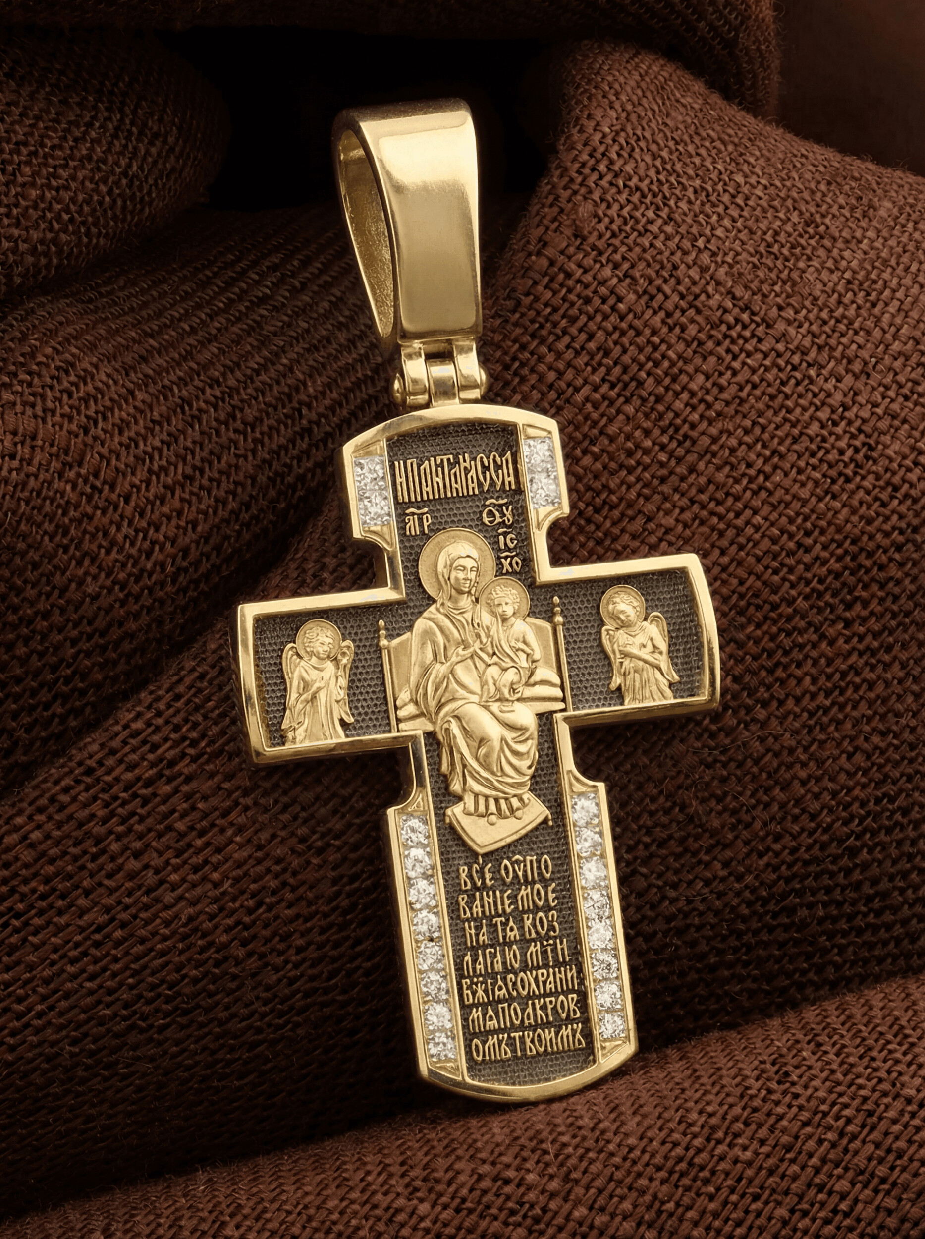 Внизу креста написана молитва обращенная к Божией Матери «Все упование мое на Тя возлагаю, Мати Божия, сохрани мя под кровом Твоим».