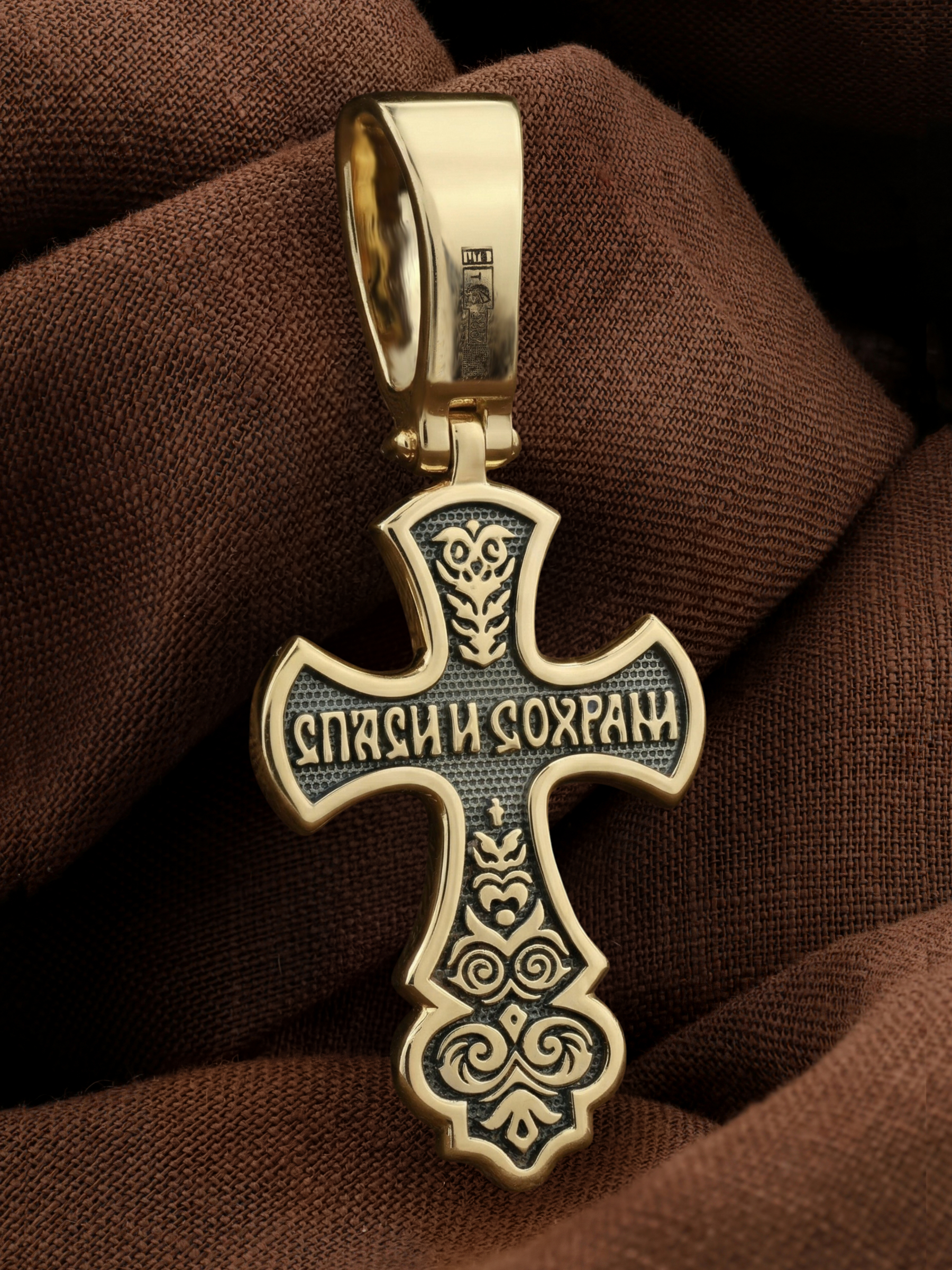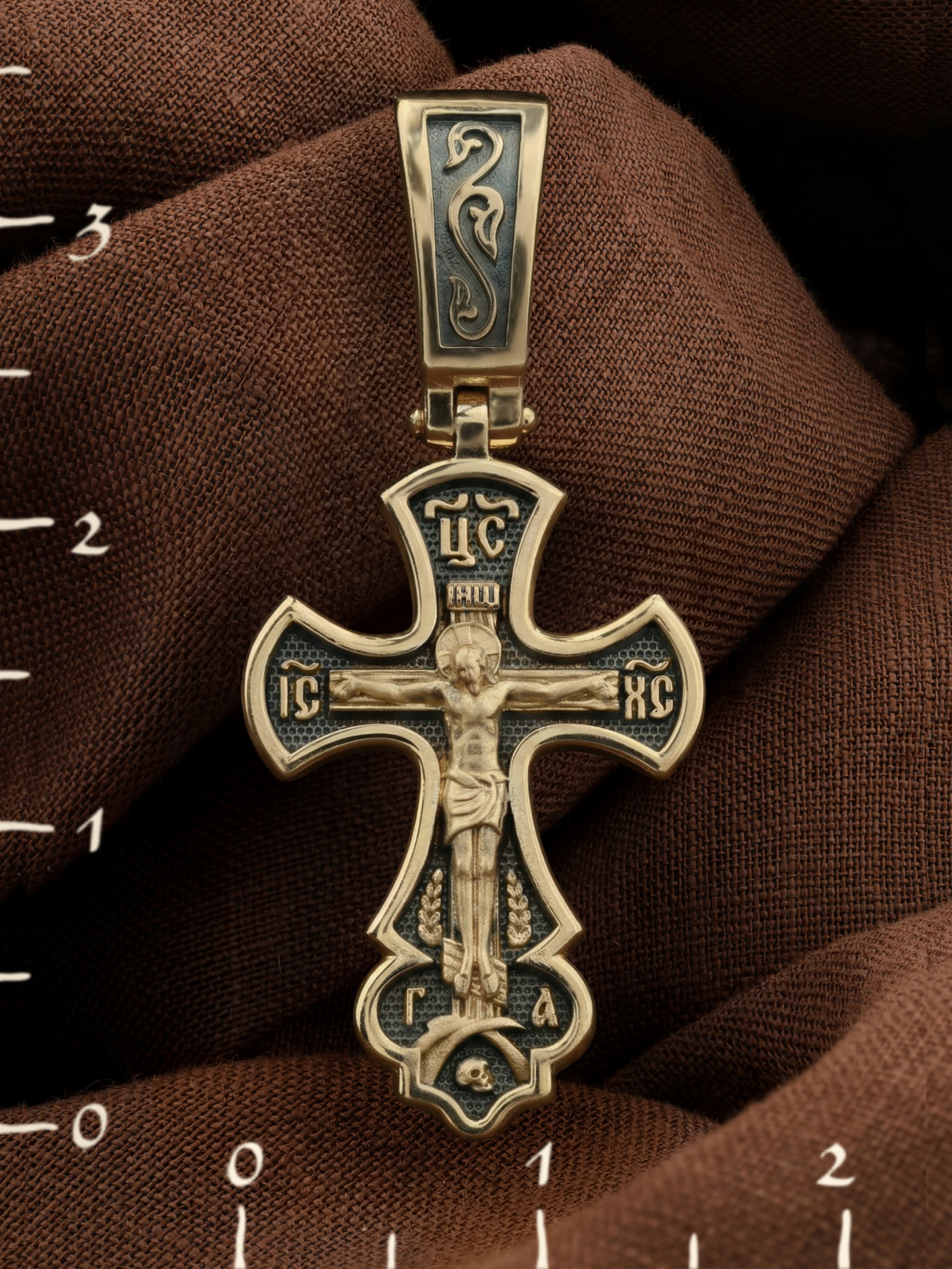 На лицевой стороне креста изображено Распятие, потому что это орудие казни Иисус Христос сделал орудием победы над грехом и смертью. Своими страданиями Он искупил грехи человечества, умерев и сошествовав во ад, победил сатану, освободил души праведников от вечной смерти и открыл им небесные врата рая. Жертва Христа сделала возможным спасение для каждого человека. На православном кресте Христос не умирает, а свободно простирает руки, ладони Иисуса открыты, будто он хочет обнять все человечество, даря им свою любовь и открывая путь к вечной жизни. Над титлом видим буквы «Ц» «С» — Царь Славы. Верхняя перекладина символизирует собой табличку с надписью «IHЦI» — Иисус Назарянин Царь Иудейский. По бокам поперечной перекладины сокращенно написано святое имя Христа «IС ХС». Буквы «Г» и «А» обозначают «Голова Адама». Возвышение, на котором стоит Крест, символизирует гору Голгофу, на которой произошло Распятие. У подножия Креста изображают прах Адама, обозначенный черепом.