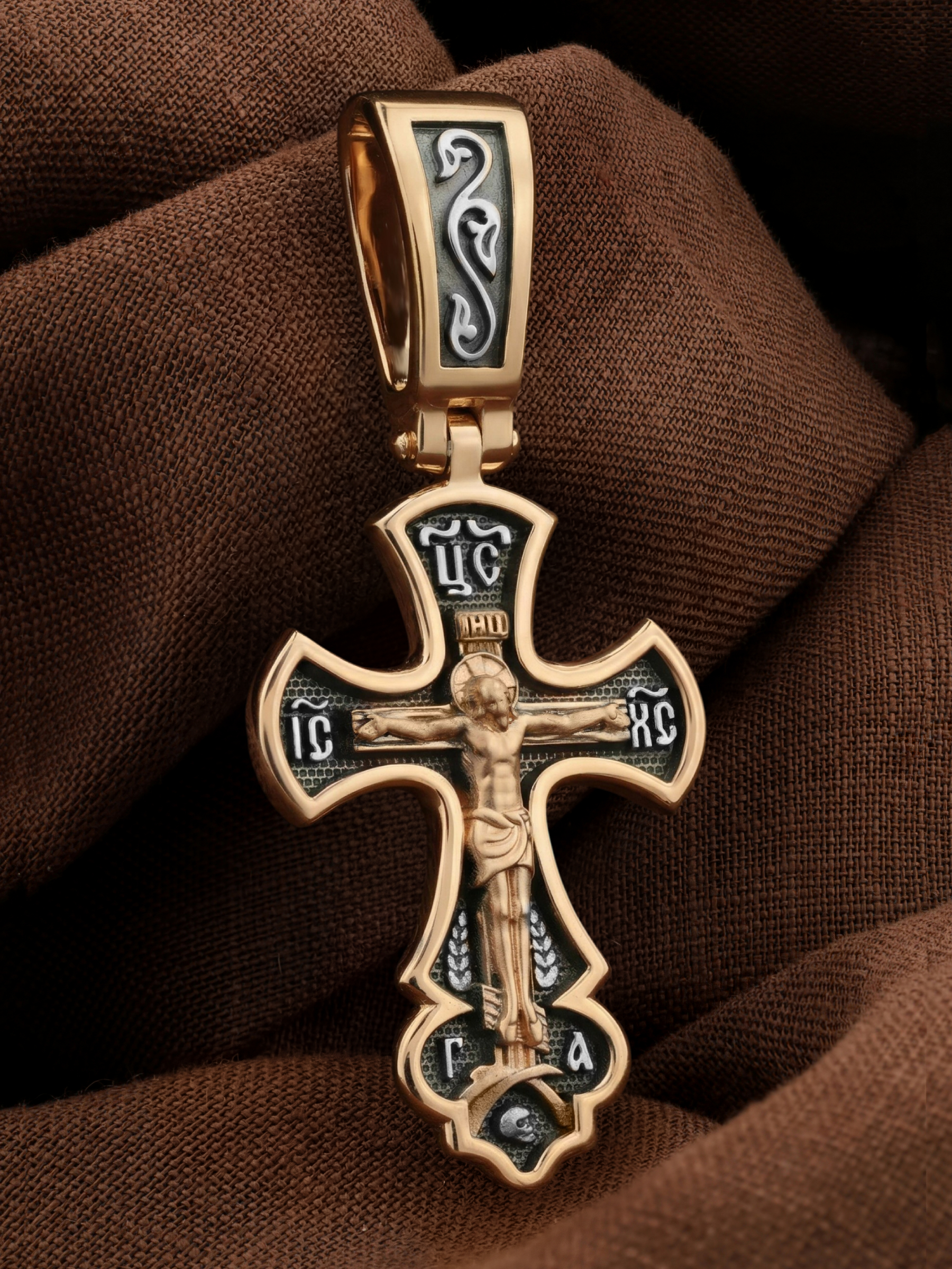 На лицевой стороне креста изображено Распятие, потому что это орудие казни Иисус Христос сделал орудием победы над грехом и смертью. Своими страданиями Он искупил грехи человечества, умерев и сошествовав во ад, победил сатану, освободил души праведников от вечной смерти и открыл им небесные врата рая. Жертва Христа сделала возможным спасение для каждого человека. На православном кресте Христос не умирает, а свободно простирает руки, ладони Иисуса открыты, будто он хочет обнять все человечество, даря им свою любовь и открывая путь к вечной жизни. Над титлом видим буквы «Ц» «С» — Царь Славы. Верхняя перекладина символизирует собой табличку с надписью «IHЦI» — Иисус Назарянин Царь Иудейский. По бокам поперечной перекладины сокращенно написано святое имя Христа «IС ХС». Буквы «Г» и «А» обозначают «Голова Адама». Возвышение, на котором стоит Крест, символизирует гору Голгофу, на которой произошло Распятие. У подножия Креста изображают прах Адама, обозначенный черепом.