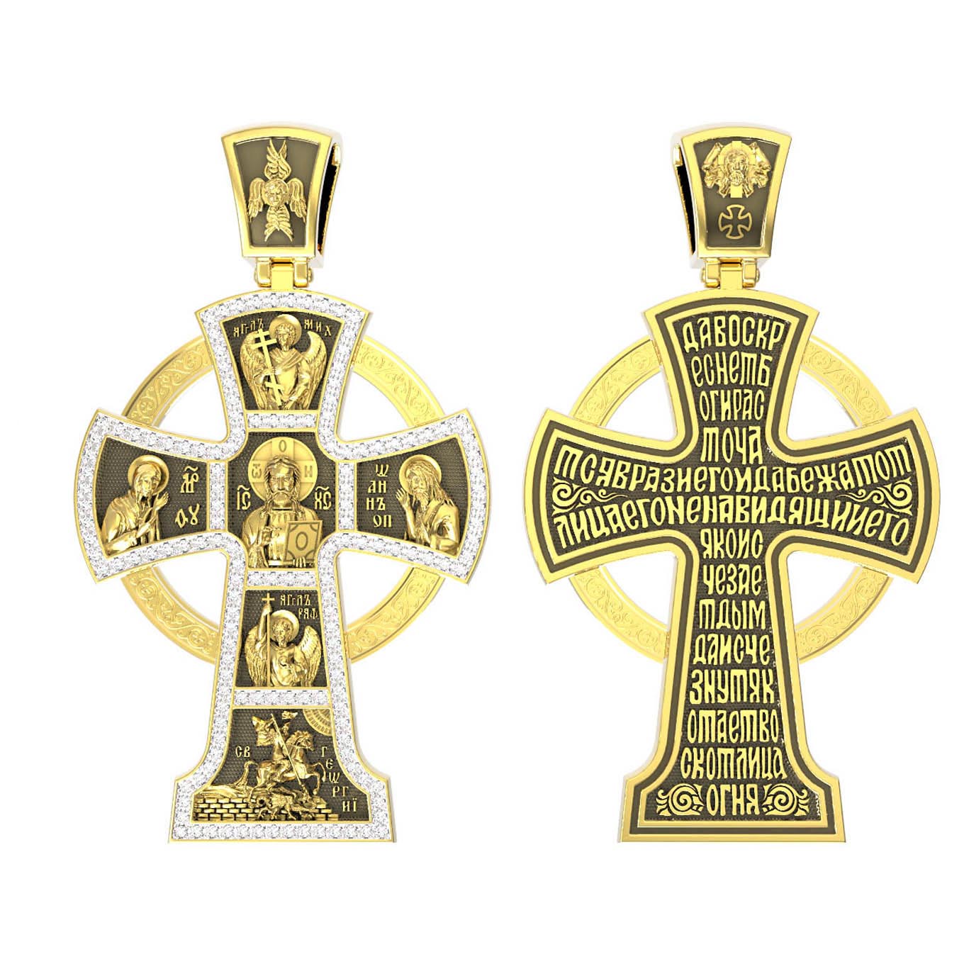 Вверху и внизу от спасителя предстоят два архангела, Михаил (Первый служитель Божественной славы, страж и защитник) и Гавриил (служитель Божественной крепости и изъявитель сокровенных Божьих тайн). Внизу помещен образ свт. Георгия Победоносца. Святой при жизни прославился не только как храбрый воин и твердый исповедник веры, но и как сострадательный, милосердный целитель и чудотворец. Святому молятся о покровительстве воинам и армии, о защите государства, сохранении и спасения России.