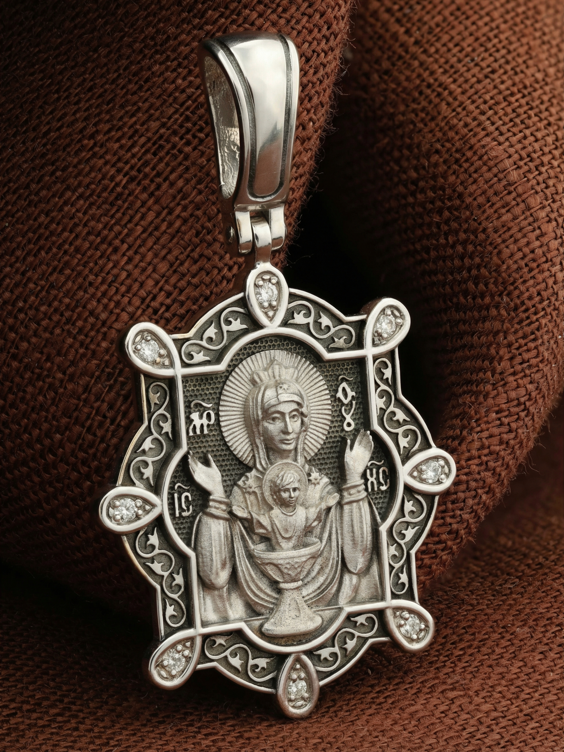 На лицевой части образка изображена икона Божией Матери «Неупиваемая чаша». Икона славится помощью в исцелении зависимостей, помогает людям обрести свободу от греховных страстей.