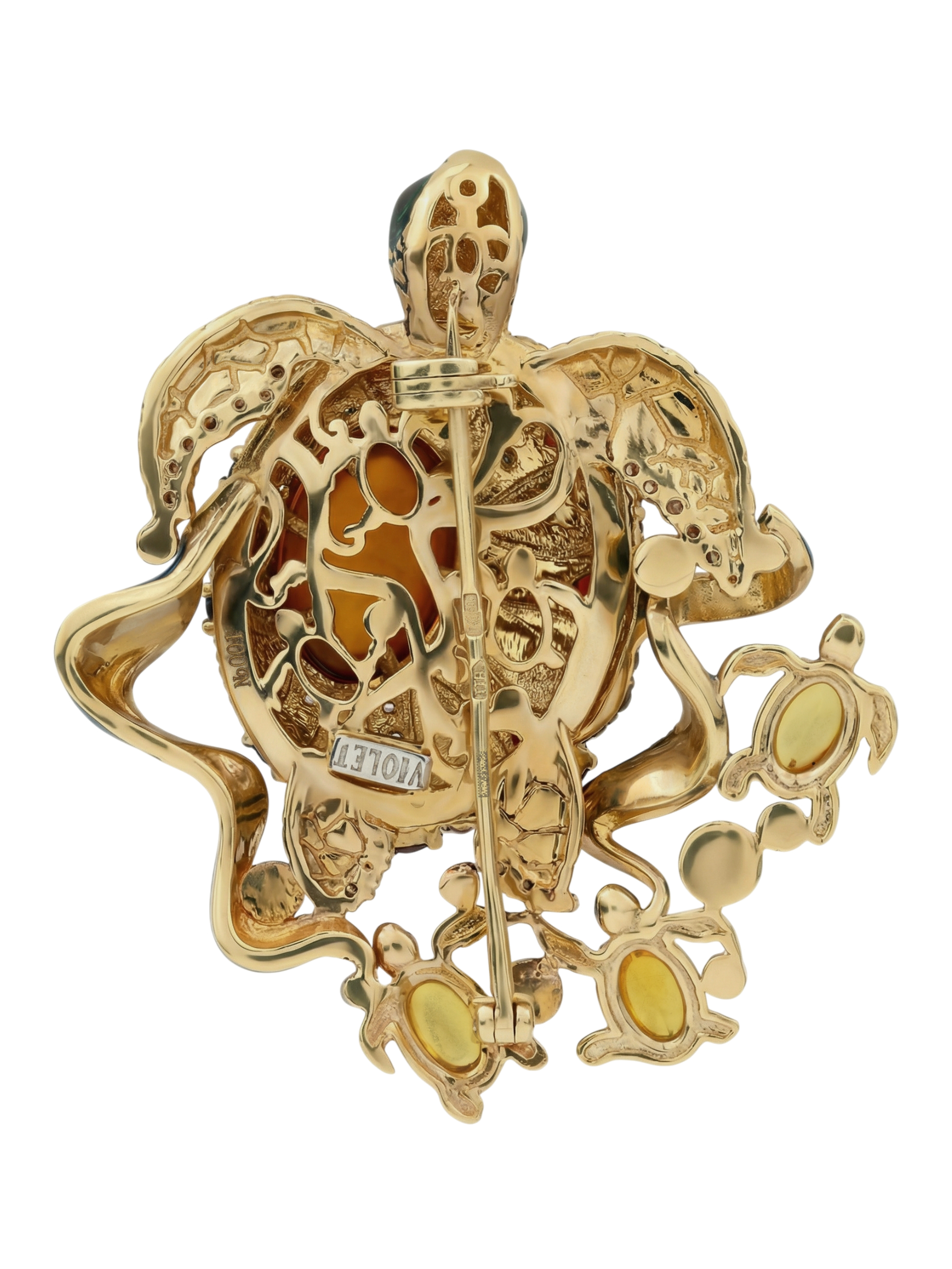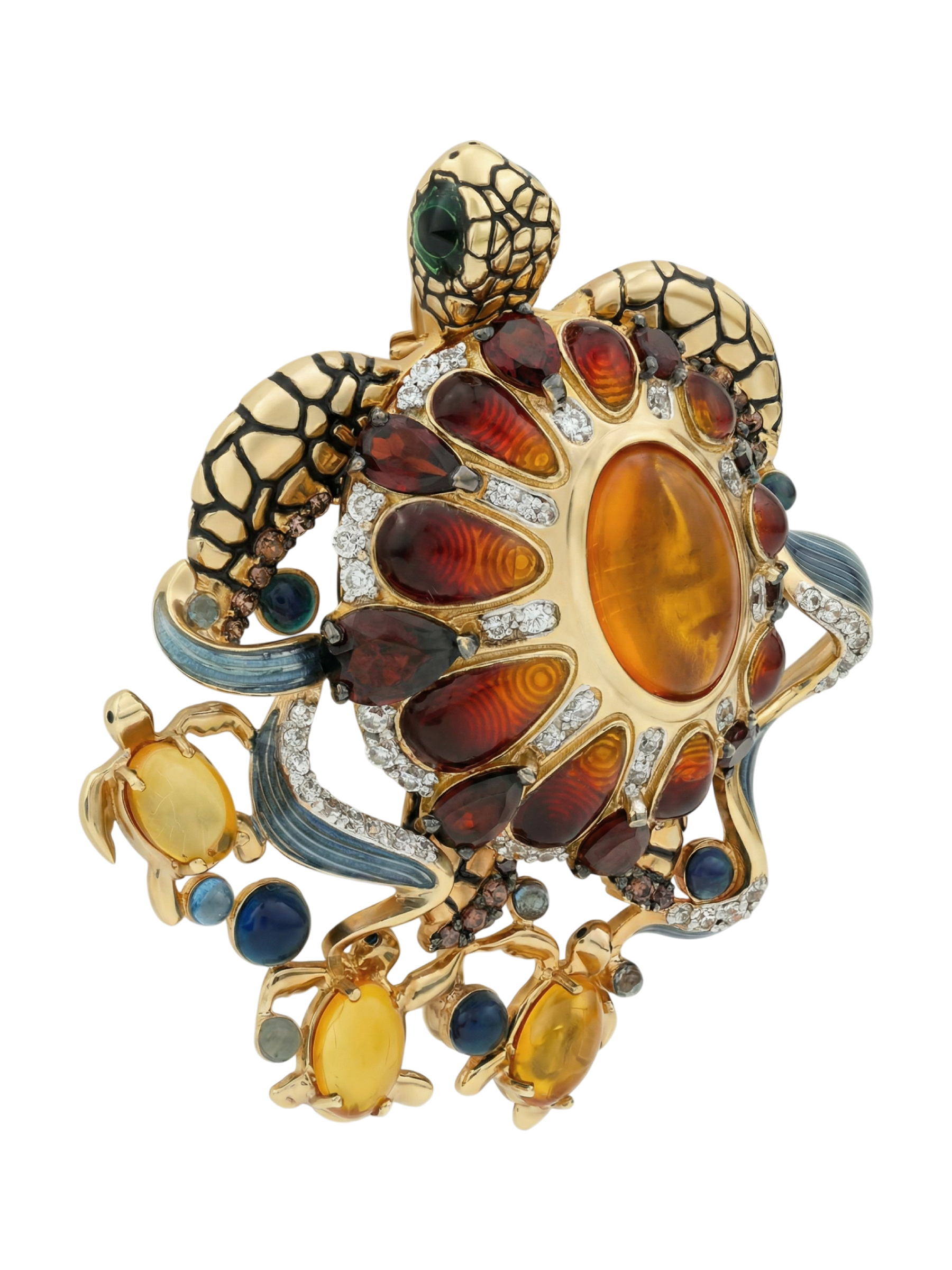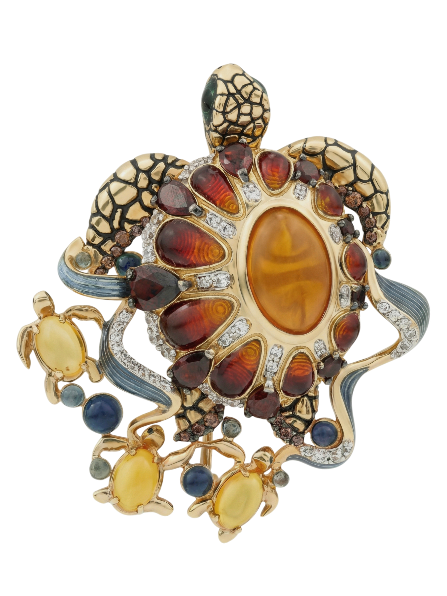Брошь из лимонного золота c эмаль, фианитом, гранатом и янтарём