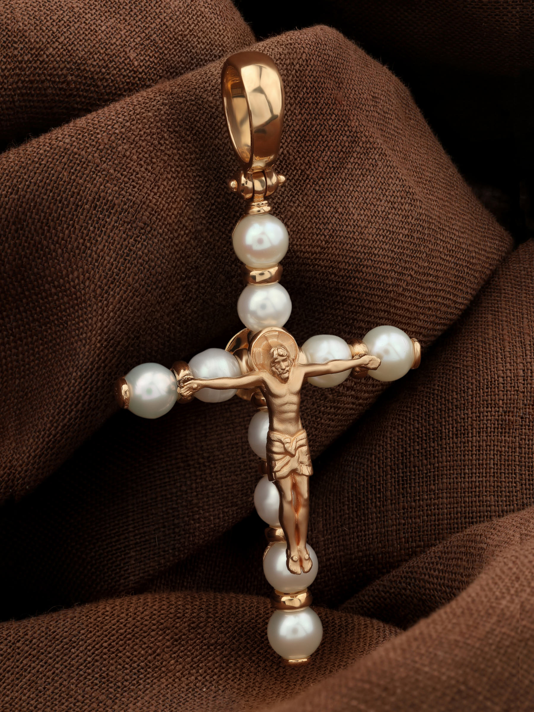 На лицевой стороне креста изображено Распятие Господа и Спасителя нашего Иисуса Христа. Своими крестными страданиями Господь смыл наши грехи, покрыл наш долг перед Богом или, на языке Писания, нас «искупил». В Голгофе сокрыта непостижимая тайна бесконечной правды и любви Бога. Крест стал символом победы добра над злом, жизни над смертью, напоминанием бесконечной Божьей любви, предметом радости. Воплотившийся Сын Божий Своею кровью освятил крест и сделал его проводником Своей благодати, источником освящения верующих. На верхней табличке, выше головы Иисуса, расположена надпись, составленная Понтием Пилатом — «IНЦI». Она означает «Иисус Назорей, Царь Иудейский». Надпись «IC» «ХC», означает Иисус Христос, помещаются на разных сторонах поперечной перекладины креста. Христос в Своей Божественной любви, над которой смерть не властна и которая, страдая, и не страдает в обычном смысле, простирает к людям со Креста Свои объятия, в которые призывается и привлекается весь мир. Поэтому Тело Его не висит, а торжественно покоится на Кресте.