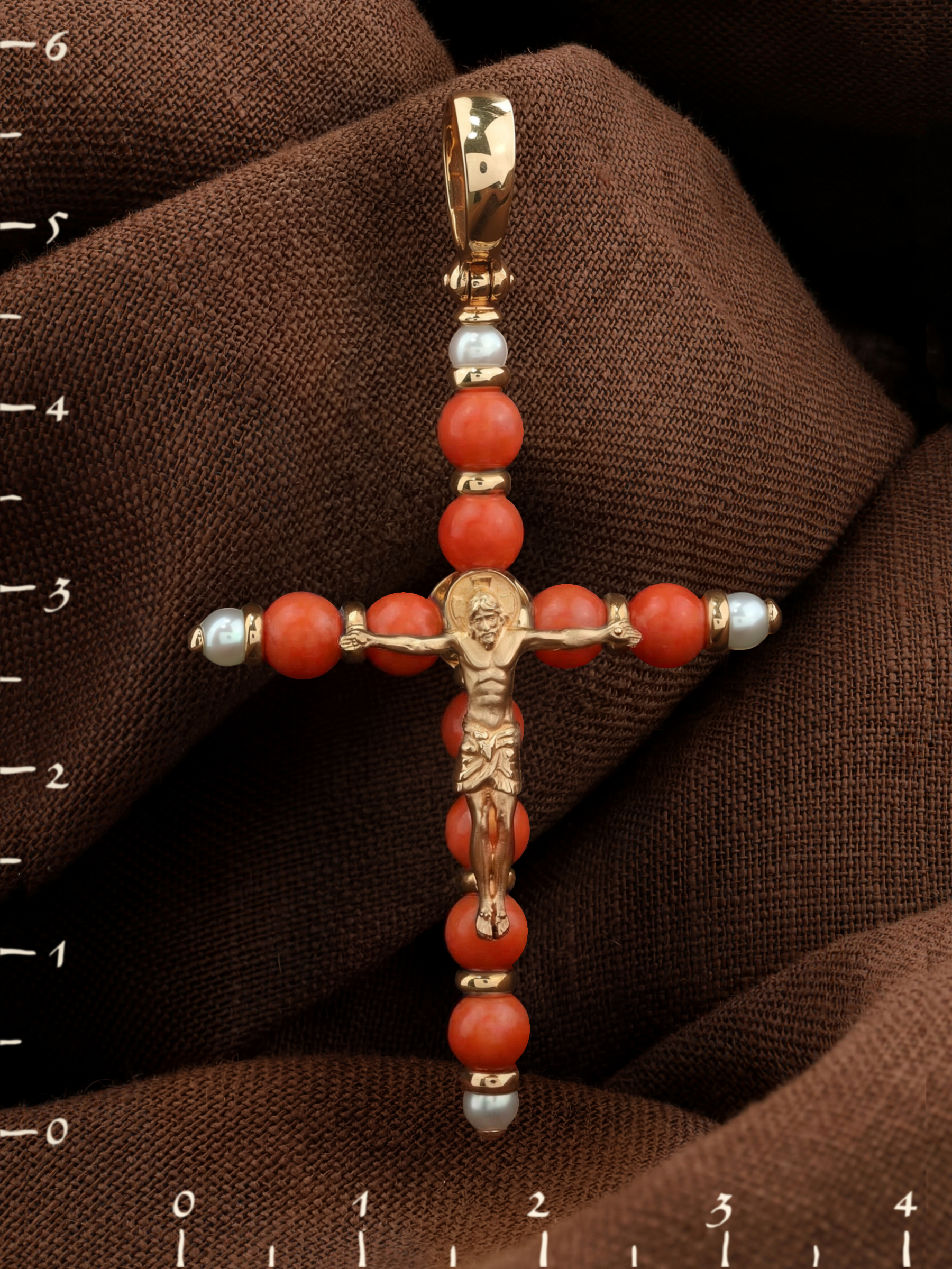 На лицевой стороне креста изображено Распятие Господа и Спасителя нашего Иисуса Христа. Своими крестными страданиями Господь смыл наши грехи, покрыл наш долг перед Богом или, на языке Писания, нас «искупил». В Голгофе сокрыта непостижимая тайна бесконечной правды и любви Бога. Крест стал символом победы добра над злом, жизни над смертью, напоминанием бесконечной Божьей любви, предметом радости. Воплотившийся Сын Божий Своею кровью освятил крест и сделал его проводником Своей благодати, источником освящения верующих. На верхней табличке, выше головы Иисуса, расположена надпись, составленная Понтием Пилатом — «IНЦI». Она означает «Иисус Назорей, Царь Иудейский». Надпись «IC» «ХC», означает Иисус Христос, помещаются на разных сторонах поперечной перекладины креста. Христос в Своей Божественной любви, над которой смерть не властна и которая, страдая, и не страдает в обычном смысле, простирает к людям со Креста Свои объятия, в которые призывается и привлекается весь мир. Поэтому Тело Его не висит, а торжественно покоится на Кресте.