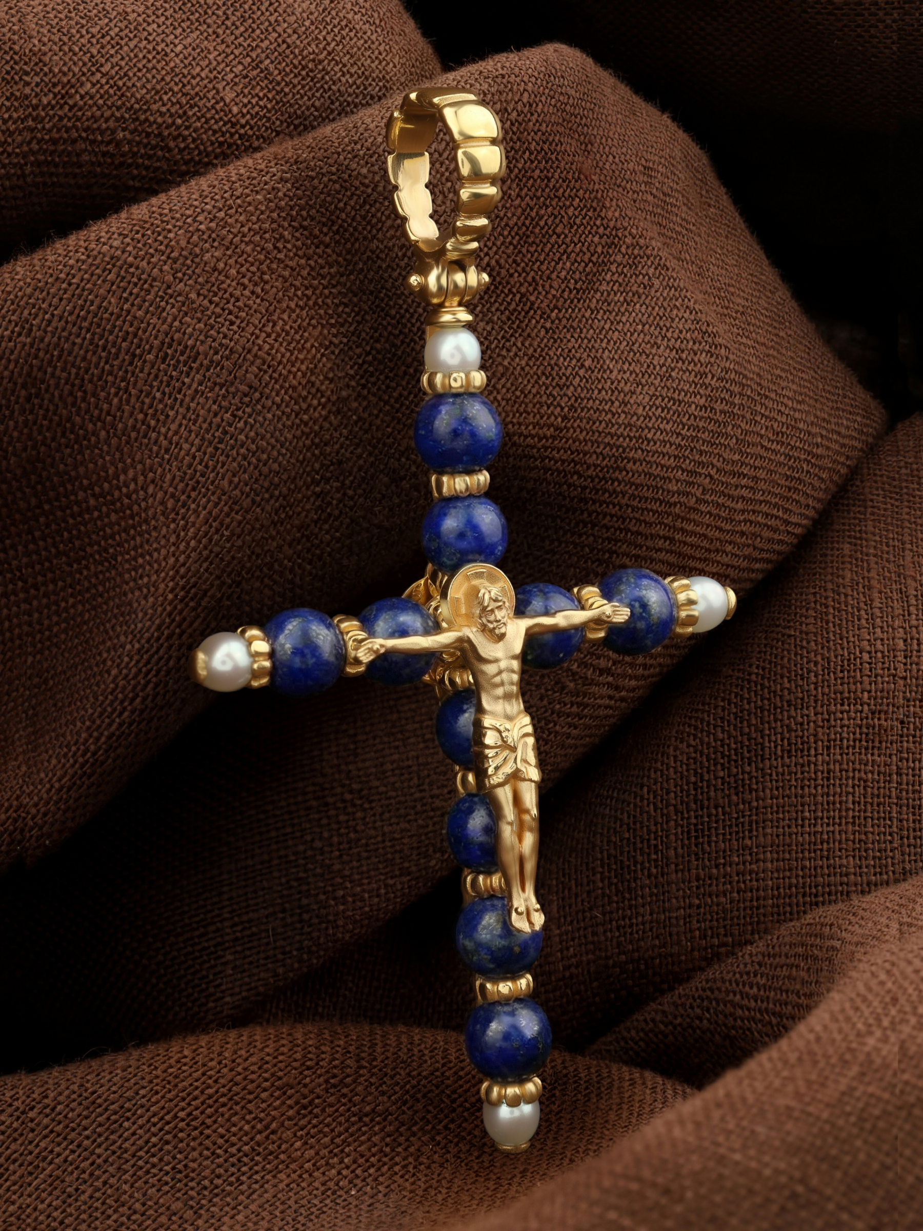 Крест из лимонного золота c жемчугом и лазуритом